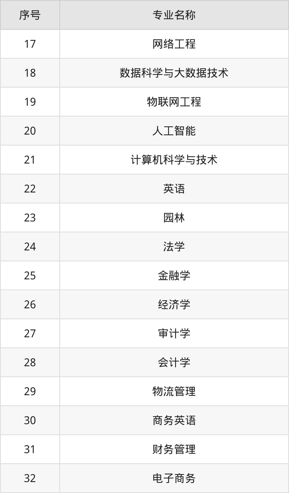 历史类(文科)本科招生专业:英语、园林、法学、金融学、经济学、审计学、会计学、物流管理、商务英语、财务管理等。