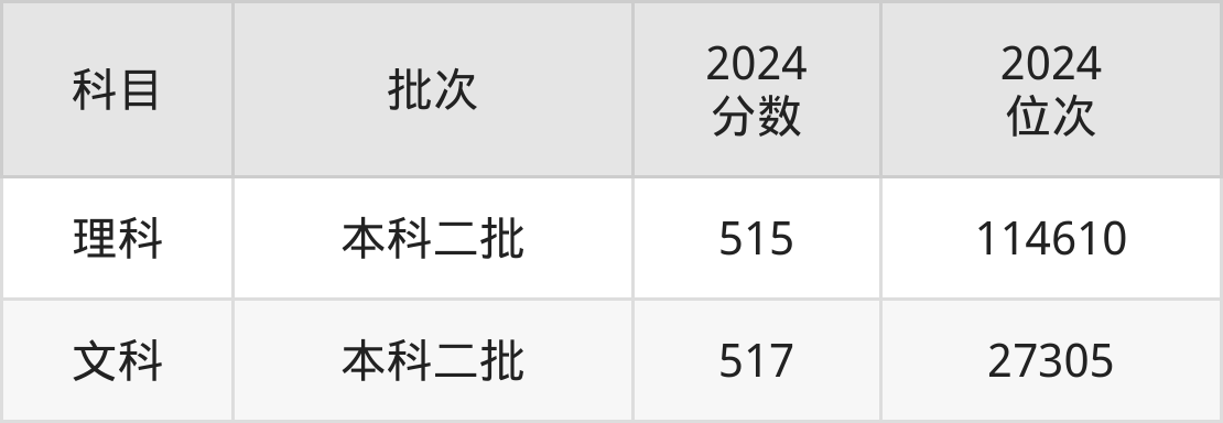 从2024年绵阳师范学院在四川省内的录取分数线来看,本科批录取分数线都在510分以上,录取分数线最高的是文科,2024年最低分为517分;录取分数线最低的是理科,2024年最低分为515分。