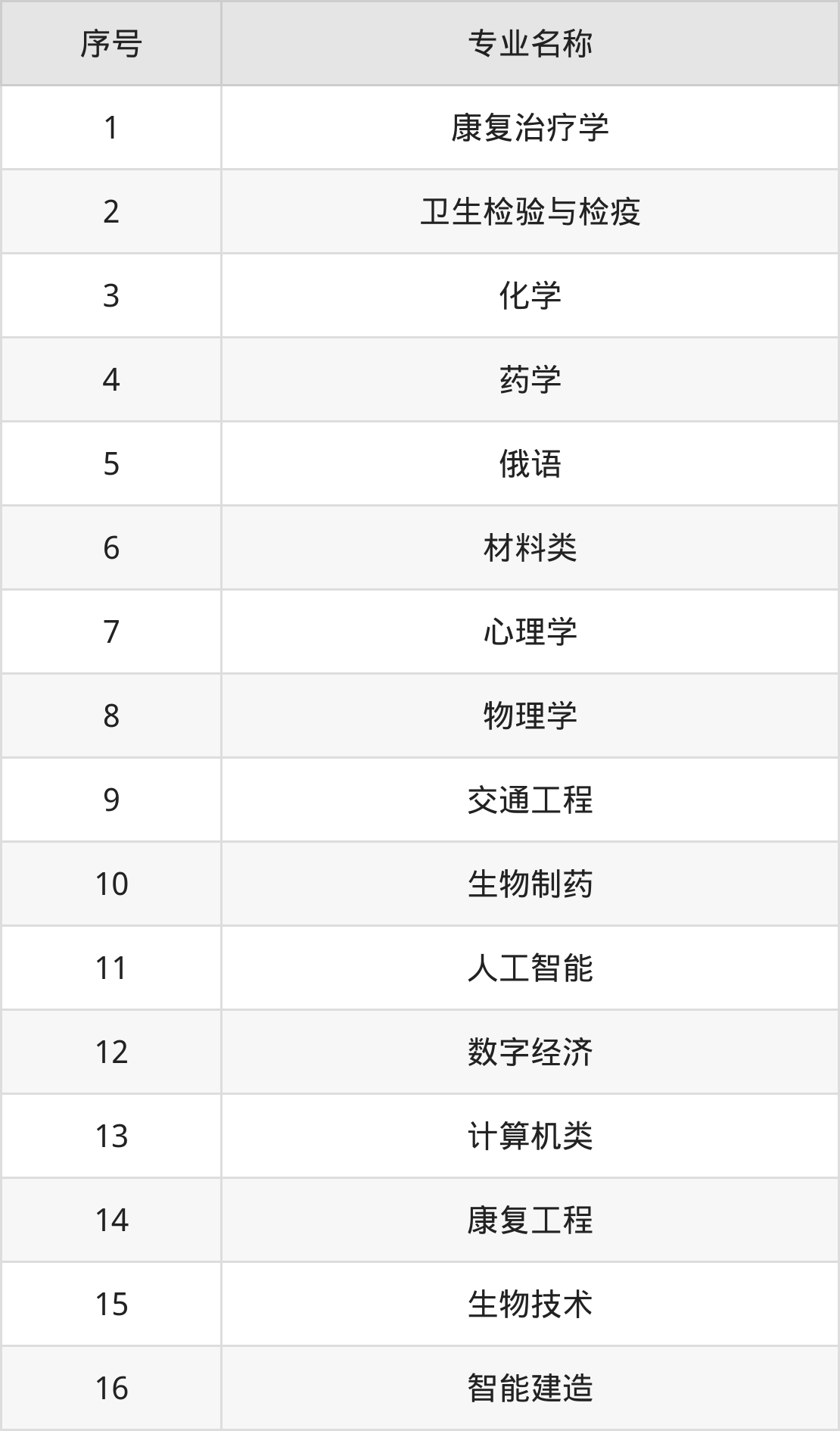 物理类(理科)本科招生专业:康复治疗学、卫生检验与检疫、化学、药学、物理学、材料类、制药工程、人工智能、生物技术、计算机类等。