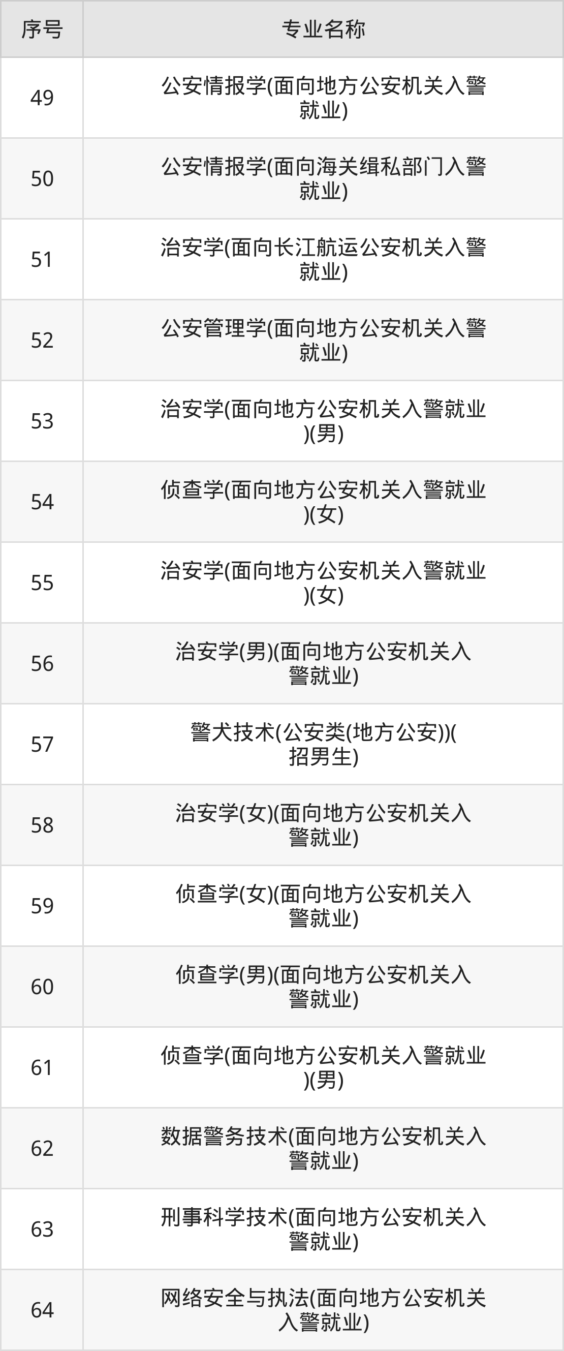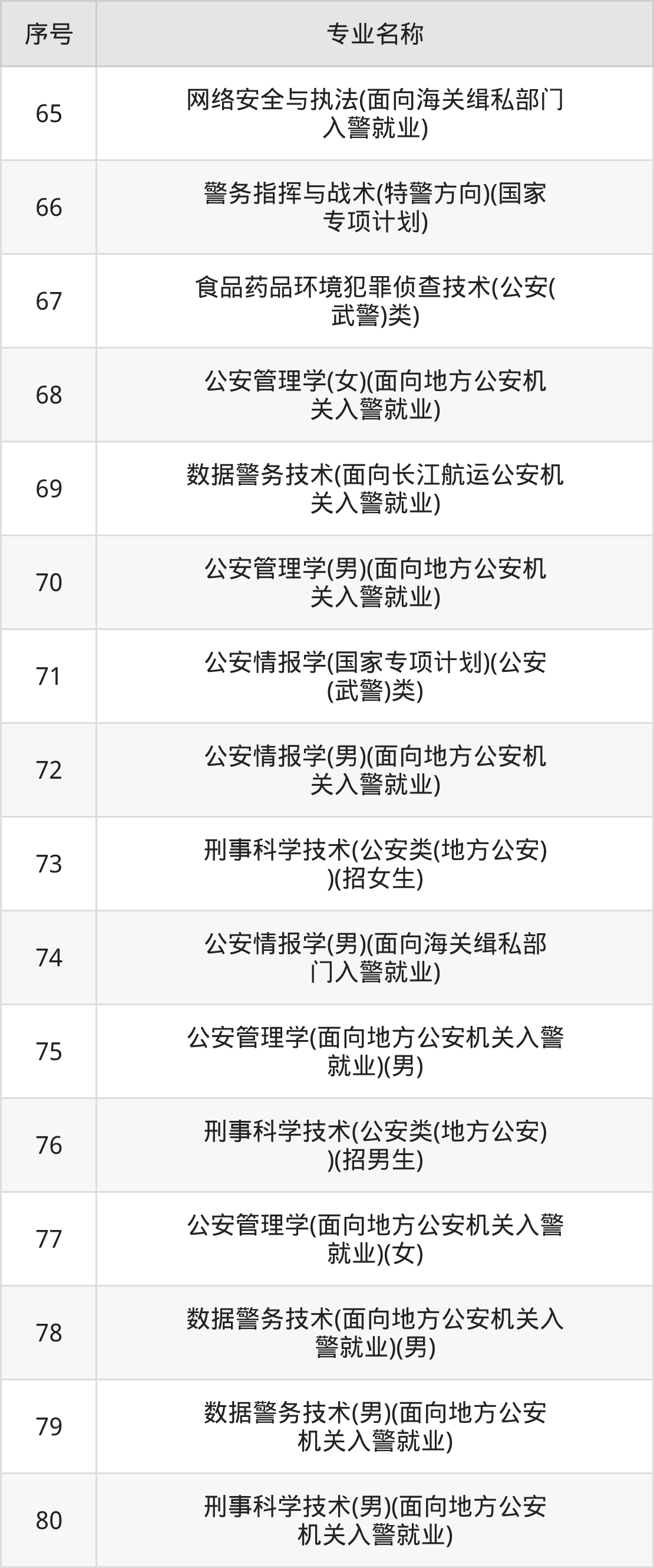 物理类(理科)本科招生专业:治安学、侦查学、警犬技术、公安管理学、公安情报学、刑事科学技术、数据警务技术、侦查学(男)、侦查学(女)、网络安全与执法等。
