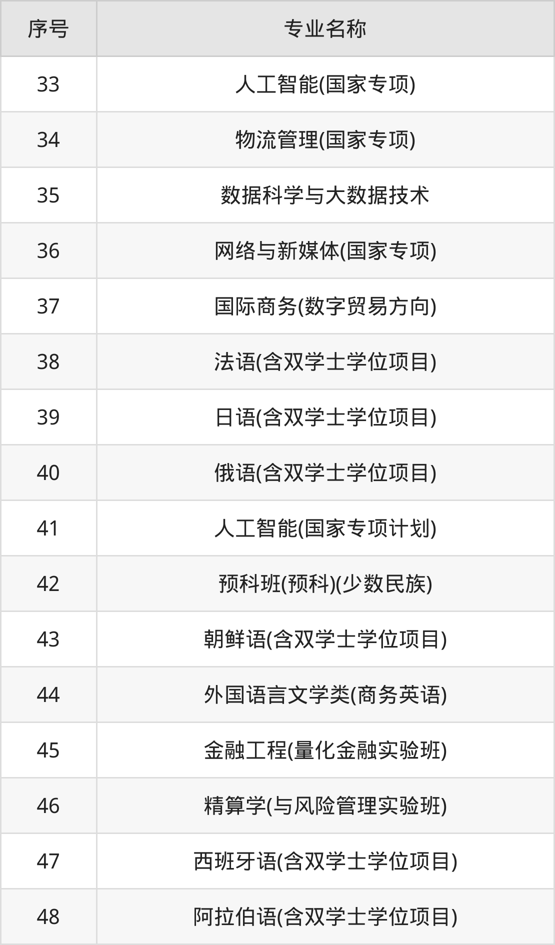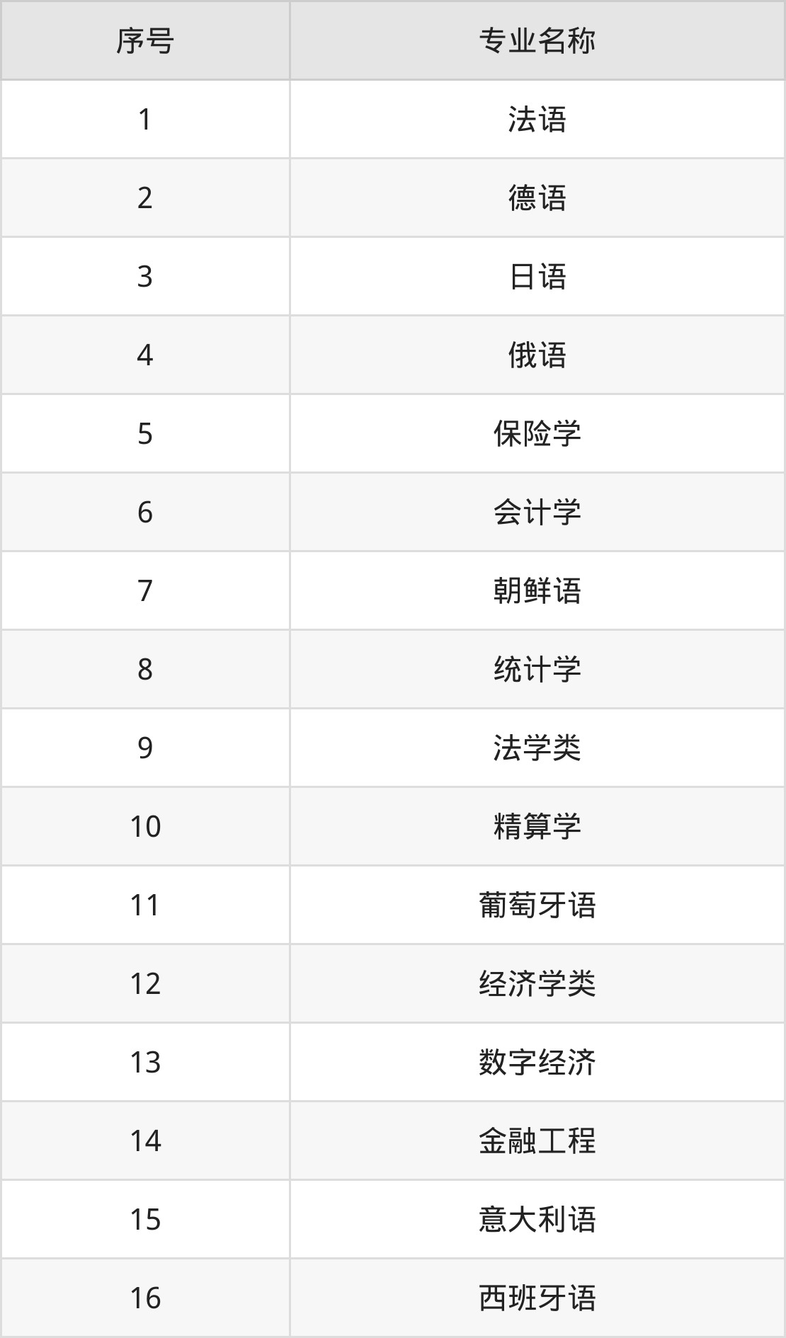 历史类(文科)本科招生专业:德语、俄语、日语、法语、法学类、朝鲜语、经济学类、葡萄牙语、金融学类、意大利语等。