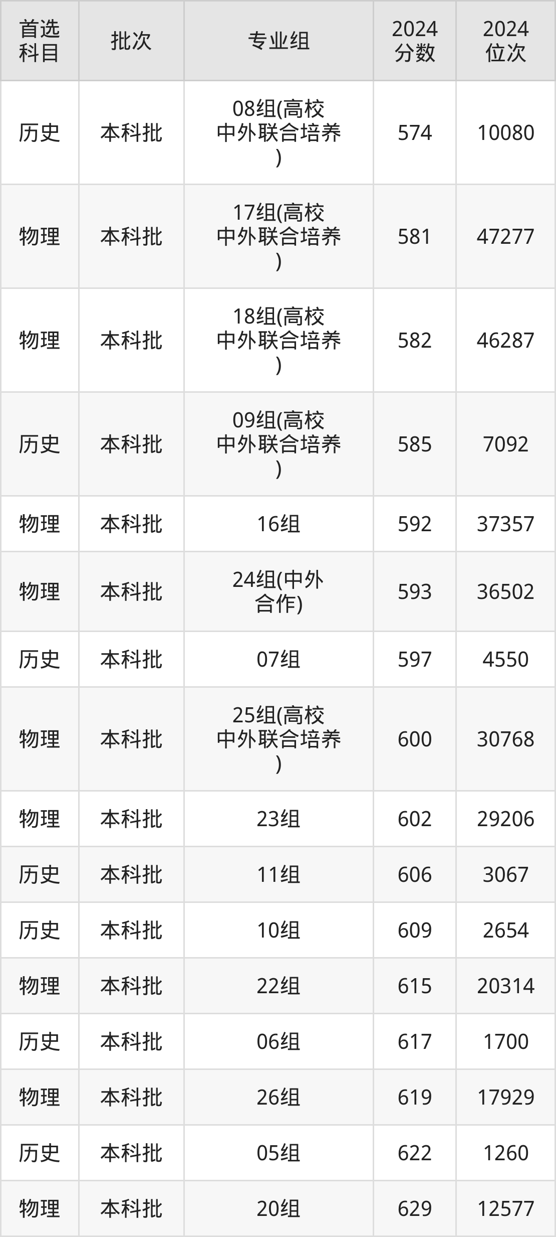 从2024年南京师范大学在江苏省内的录取分数线来看,本科批录取分数线都在570分以上,录取分数线最高的是19组,2024年最低分为643分;录取分数线最低的是08组(高校中外联合培养),2024年最低分为574分。