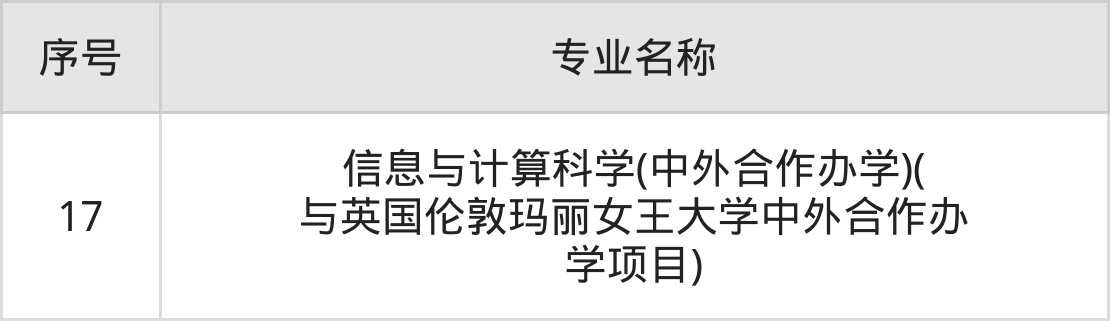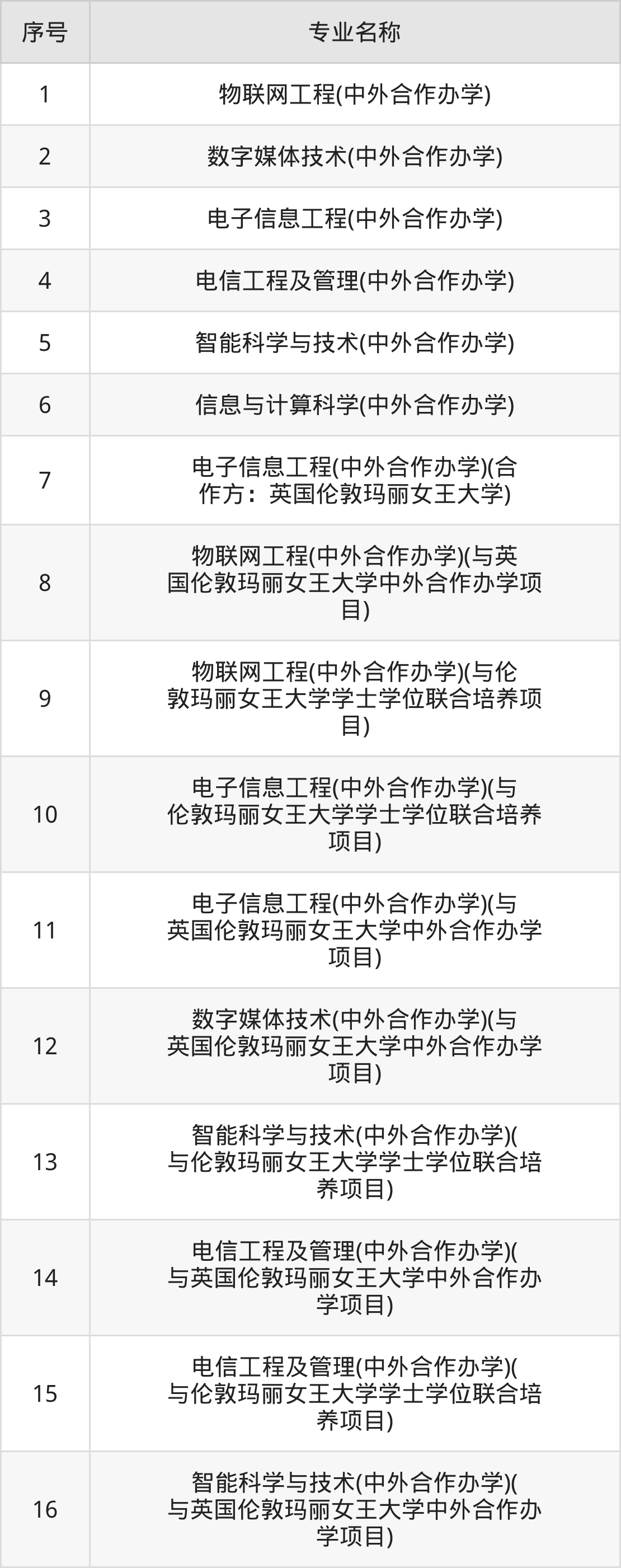 物理类(理科)本科招生专业:物联网工程(中外合作办学)、电子信息工程(中外合作办学)、数字媒体技术(中外合作办学)、电信工程及管理(中外合作办学)、智能科学与技术(中外合作办学)、信息与计算科学(中外合作办学)、电子信息工程(中外合作办学)(合作方:英国伦敦玛丽女王大学)、物联网工程(中外合作办学)(与英国伦敦玛丽女王大学中外合作办学项目)、电子信息工程(中外合作办学)(与英国伦敦玛丽女王大学中外合作办学项目)、数字媒体技术(中外合作办学)(与英国伦敦玛丽女王大学中外合作办学项目)等。