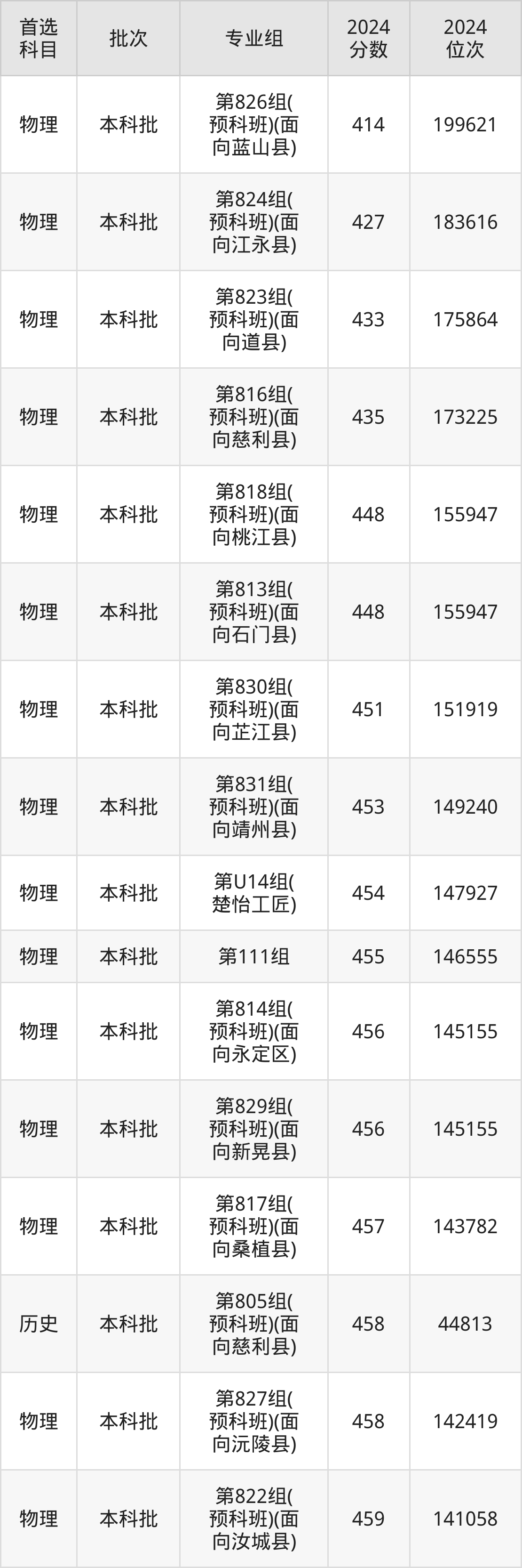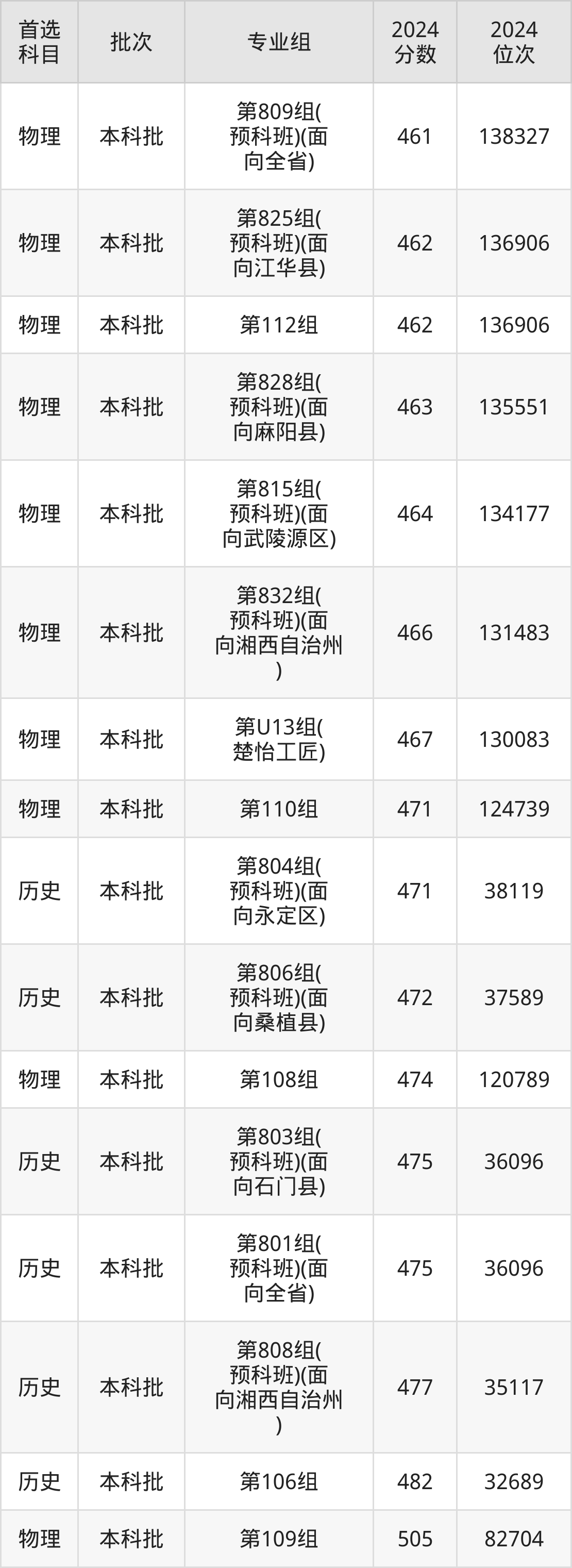 从2024年湘南学院在湖南省内的录取分数线来看,本科批录取分数线都在410分以上,录取分数线最高的是第109组,2024年最低分为505分;录取分数线最低的是第826组(预科班)(面向蓝山县),2024年最低分为414分。