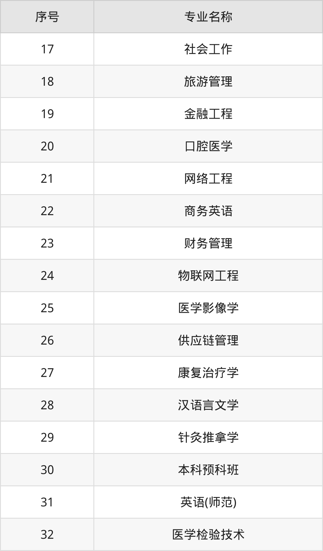 历史类(文科)本科招生专业:英语、法学、翻译、新闻学、旅游管理、体育教育、财务管理、社会工作、学前教育、商务英语等。
