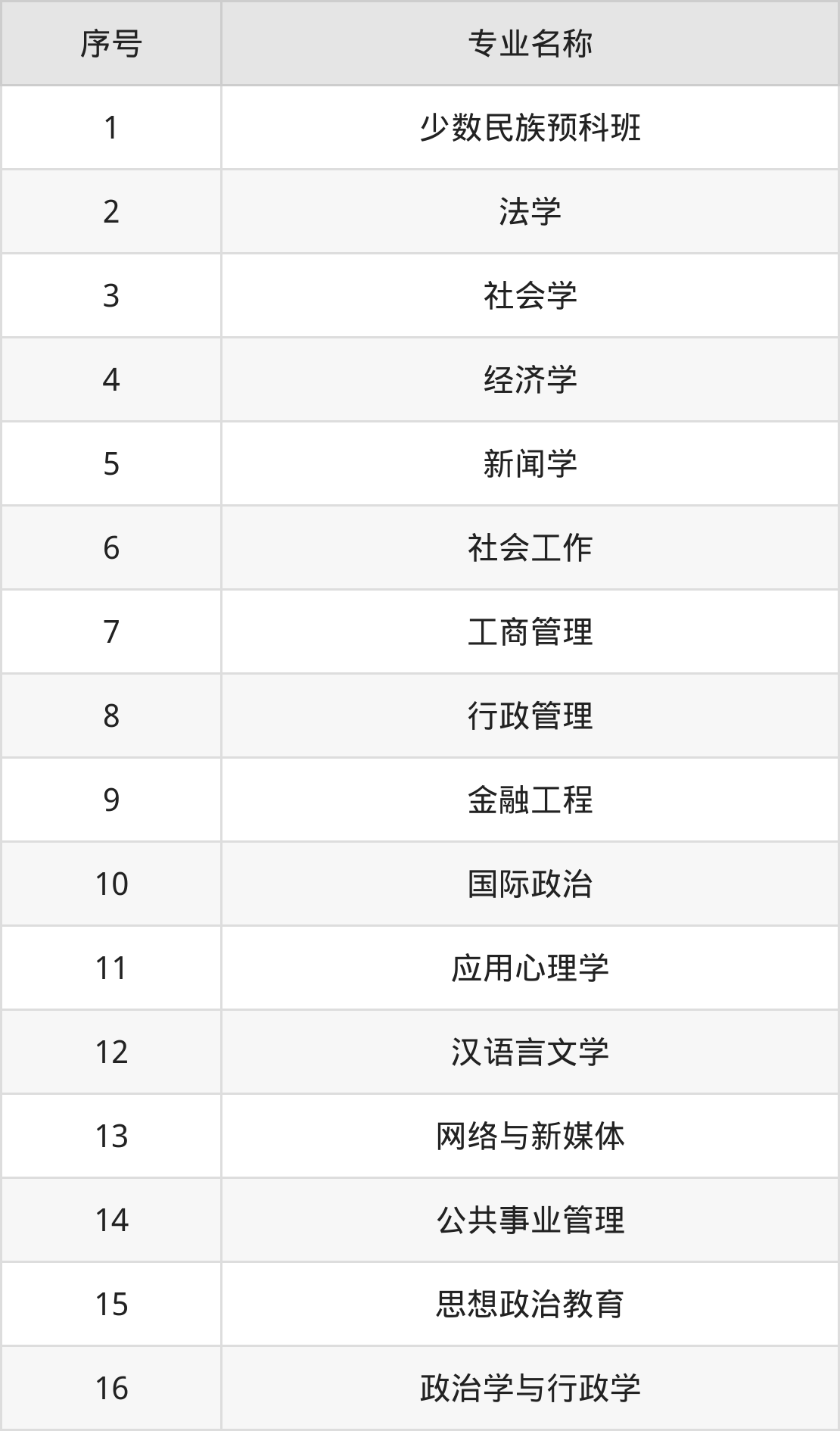 历史类(文科)本科招生专业:少数民族预科班、法学、新闻学、社会学、国际政治、行政管理、工商管理、社会工作、汉语言文学、应用心理学等。