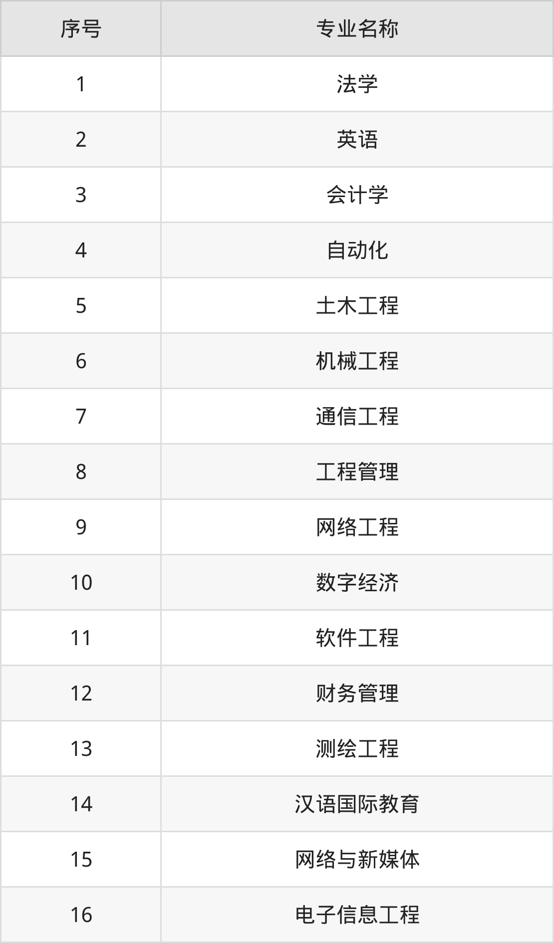 历史类(文科)本科招生专业:英语、法学、会计学、财务管理、网络与新媒体、汉语国际教育、国际经济与贸易。