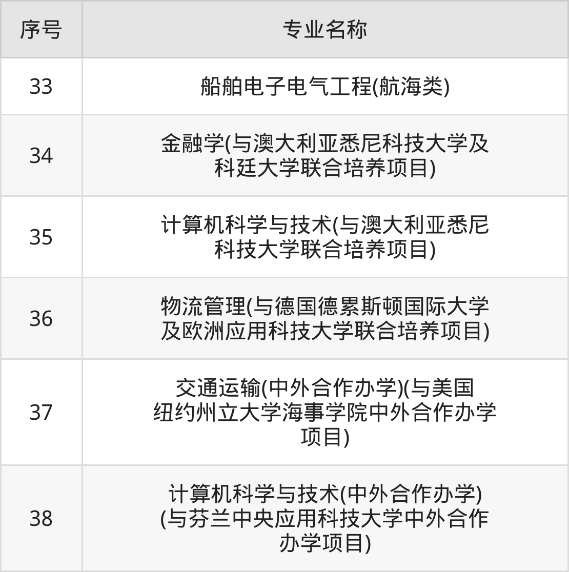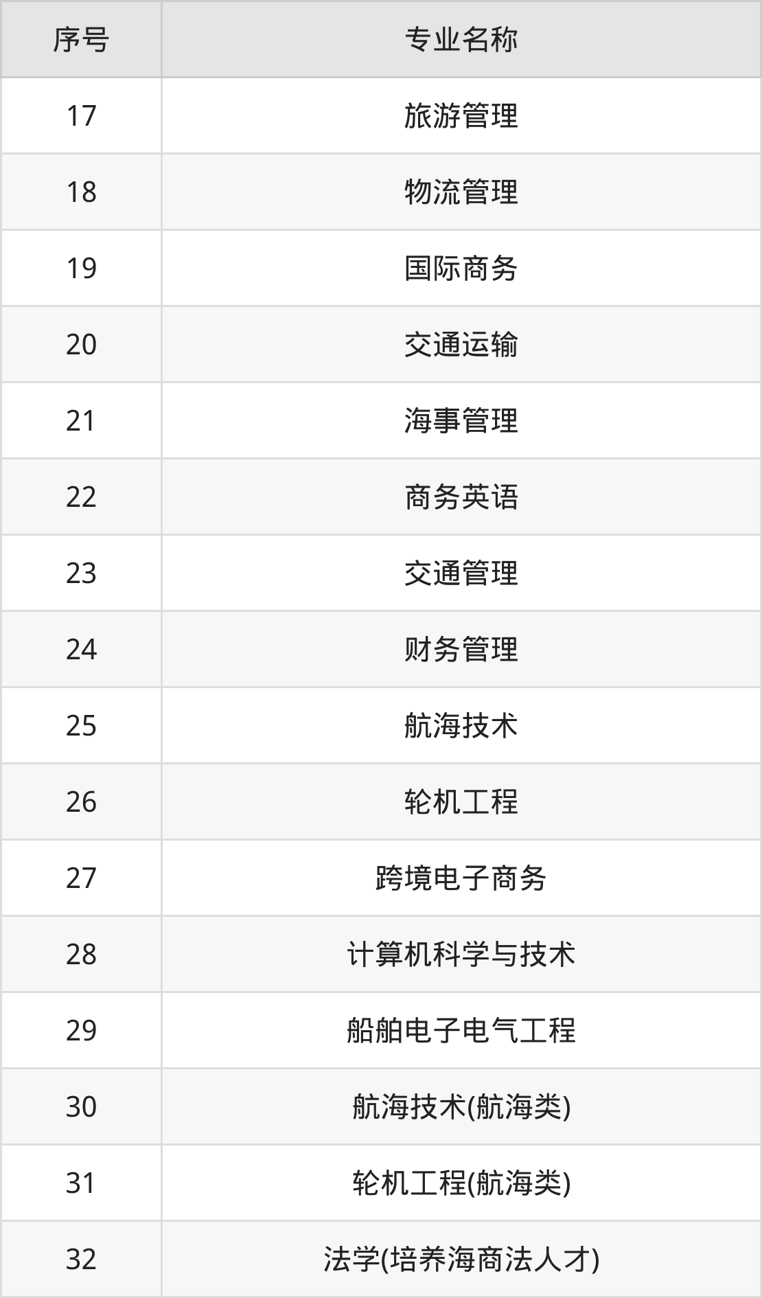 历史类(文科)本科招生专业:金融学、海事管理、商务英语、财务管理、国际商务、交通管理、物流管理、旅游管理、跨境电子商务、法学(培养海商法人才)等。