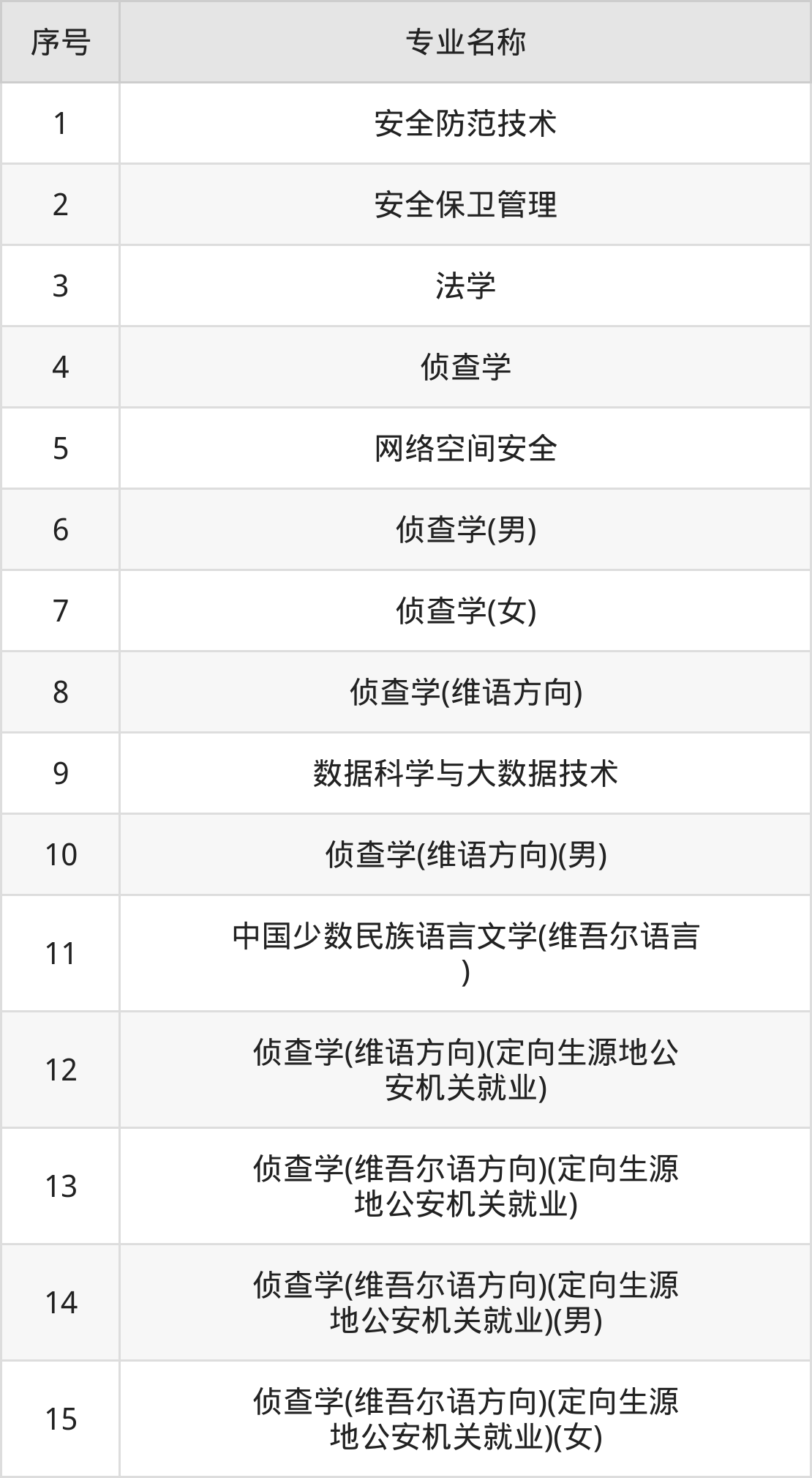 历史类(文科)本科招生专业:法学、侦查学(维语方向)(男)、中国少数民族语言文学(维吾尔语言)、侦查学(维语方向)(定向生源地公安机关就业)、侦查学(维吾尔语方向)(定向生源地公安机关就业)。