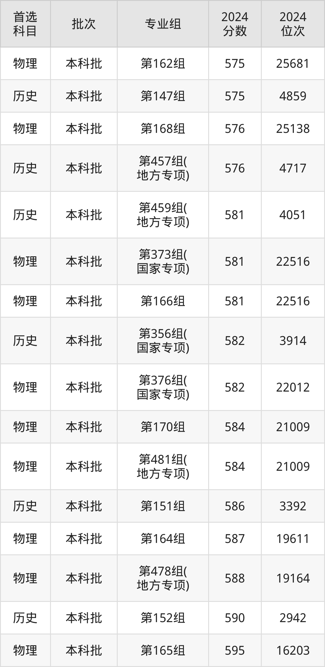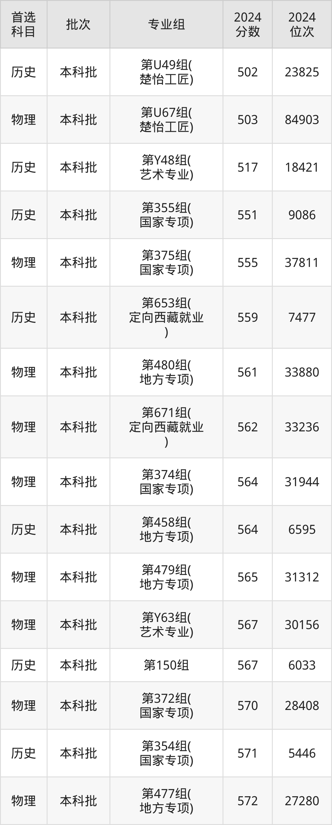 从2024年湖南师范大学在湖南省内的录取分数线来看,本科批录取分数线都在500分以上,录取分数线最高的是第169组,2024年最低分为601分;录取分数线最低的是第U49组(楚怡工匠),2024年最低分为502分。