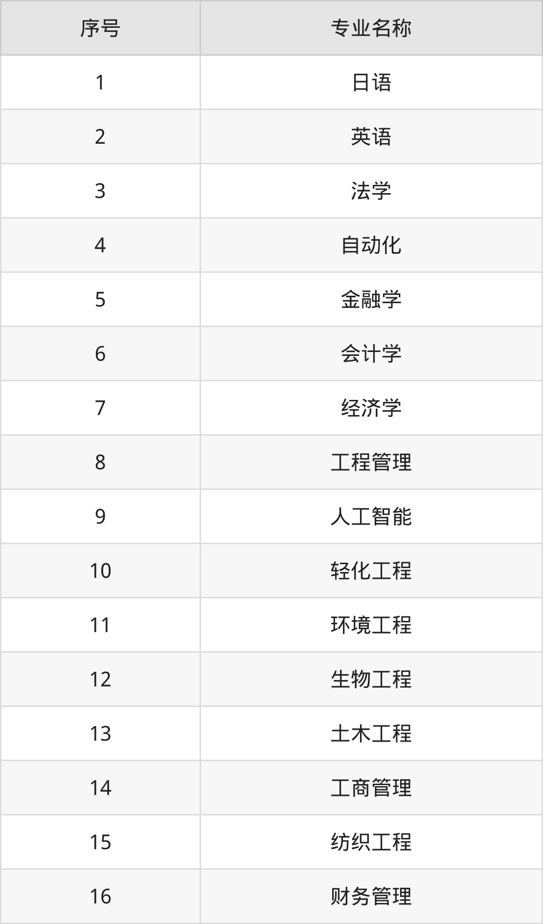 物理类(理科)本科招生专业:日语、英语、法学、金融学、会计学、经济学、自动化、财务管理、纺织工程、生物工程等。