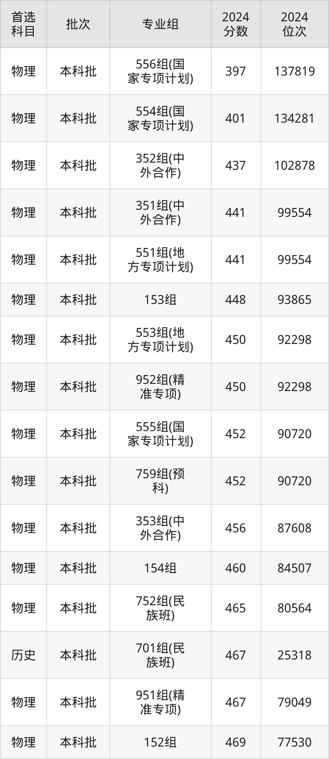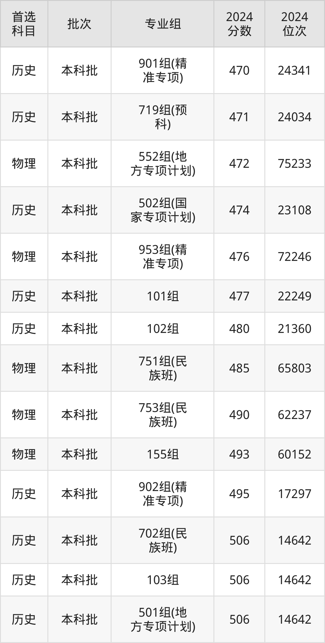 从2024年北部湾大学在广西壮族自治区内的录取分数线来看,本科批录取分数线都在390分以上,录取分数线最高的是501组(地方专项计划),2024年最低分为506分;录取分数线最低的是556组(国家专项计划),2024年最低分为397分。