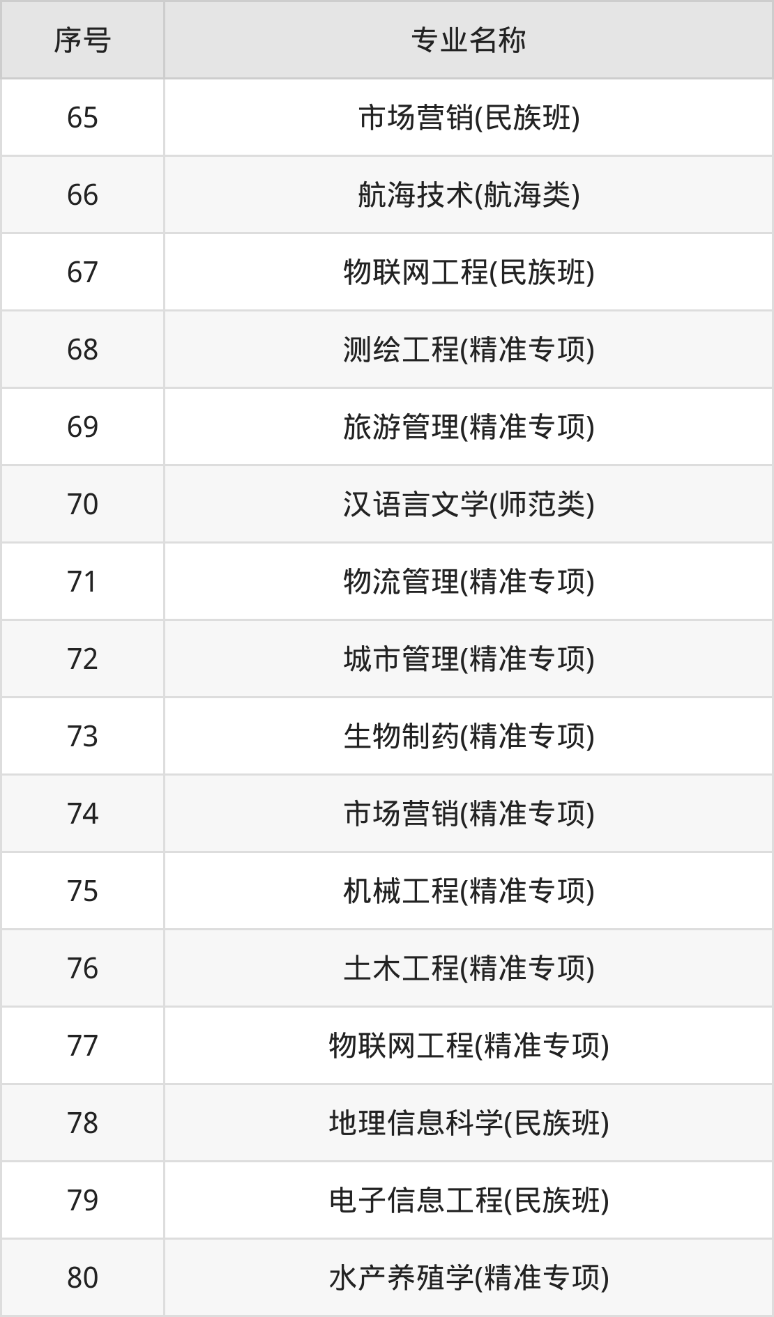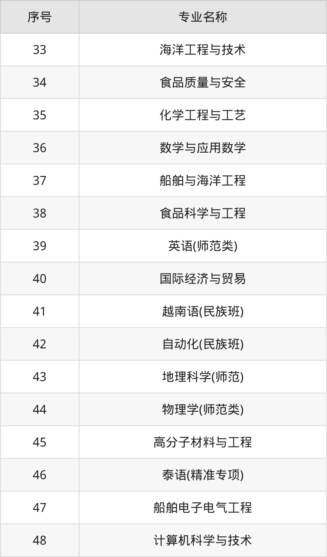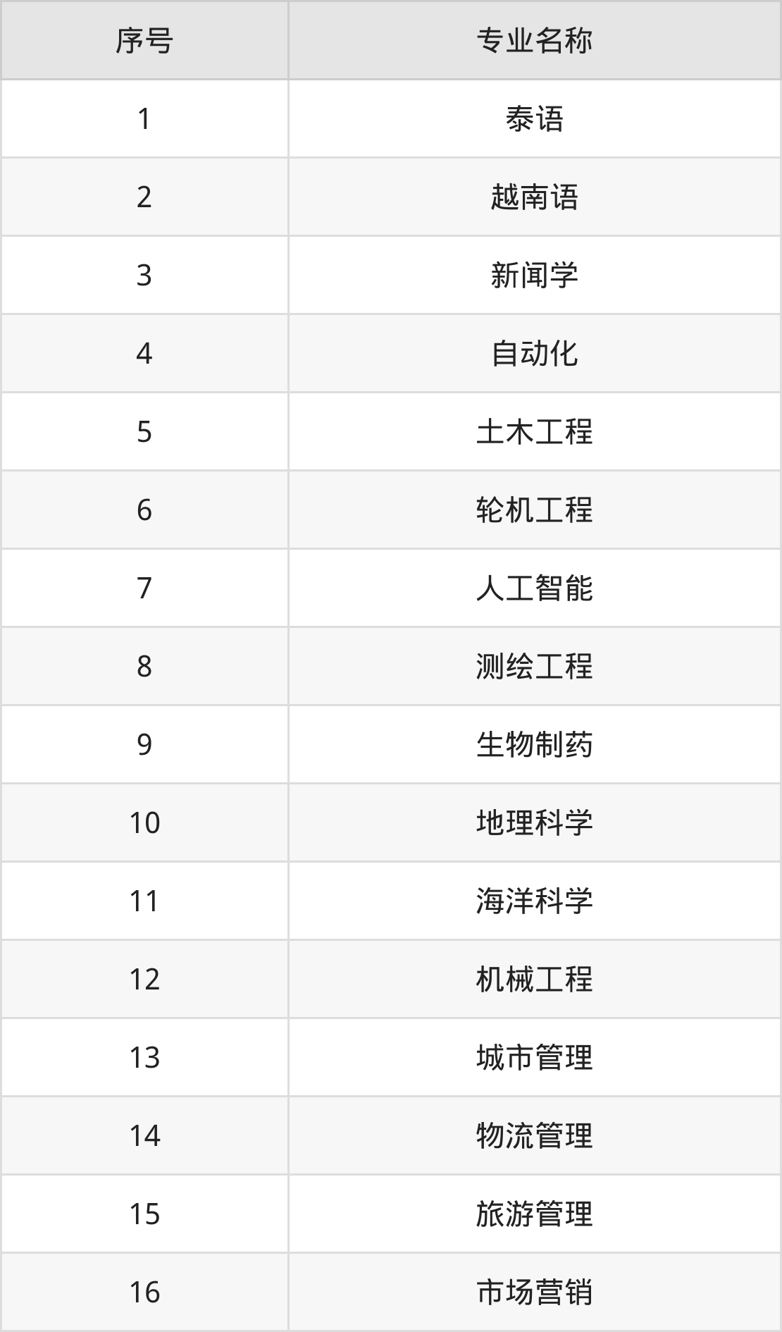 历史类(文科)本科招生专业:泰语、新闻学、越南语、金融工程、旅游管理、财务管理、地理科学、物流管理、市场营销、城市管理等。