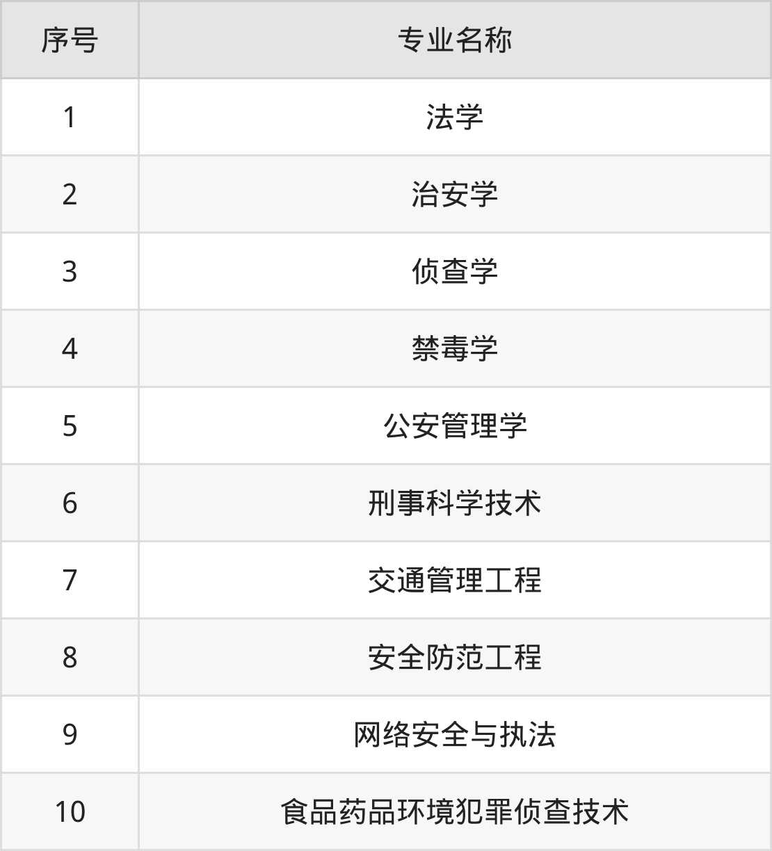历史类(文科)本科招生专业:法学、治安学、侦查学、禁毒学、公安管理学。