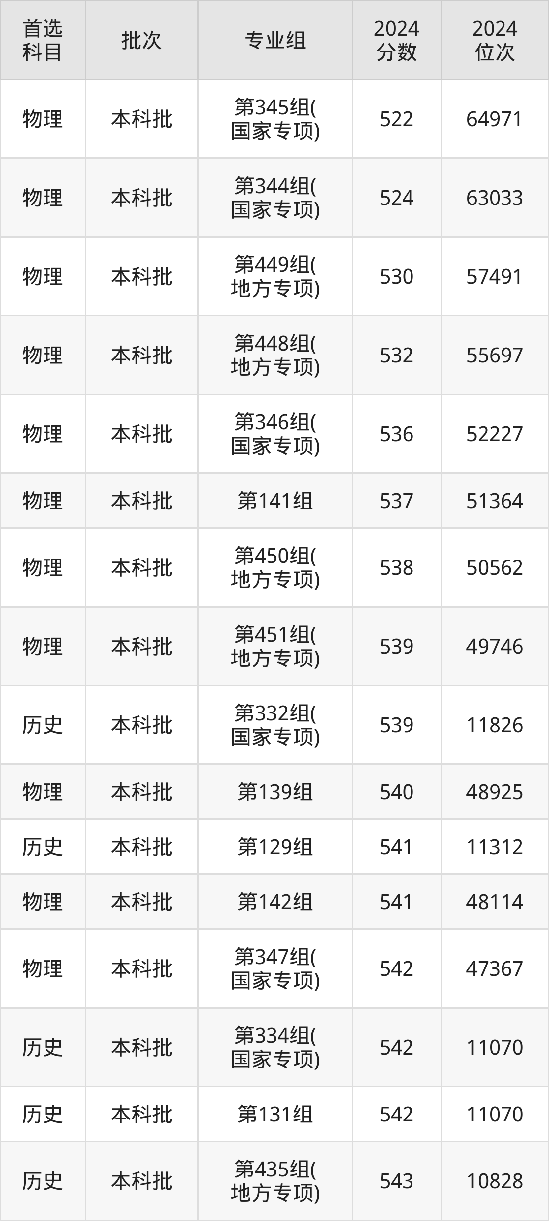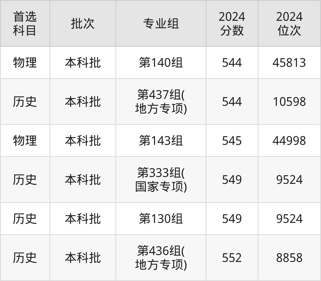 从2024年湖南科技大学在湖南省内的录取分数线来看,本科批录取分数线都在520分以上,录取分数线最高的是第436组(地方专项),2024年最低分为552分;录取分数线最低的是第345组(国家专项),2024年最低分为522分。