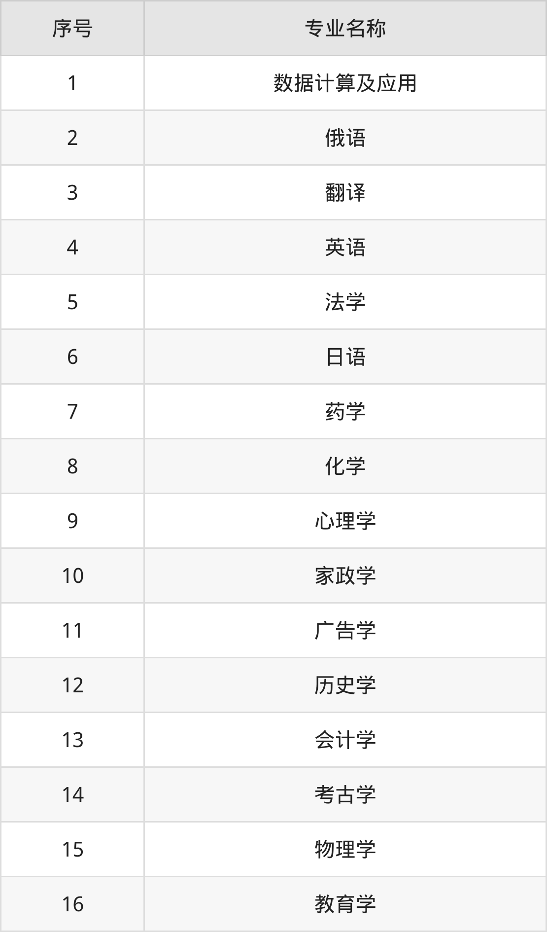历史类(文科)本科招生专业:英语、俄语、日语、法学、翻译、历史学、广告学、家政学、教育学、新闻学等。