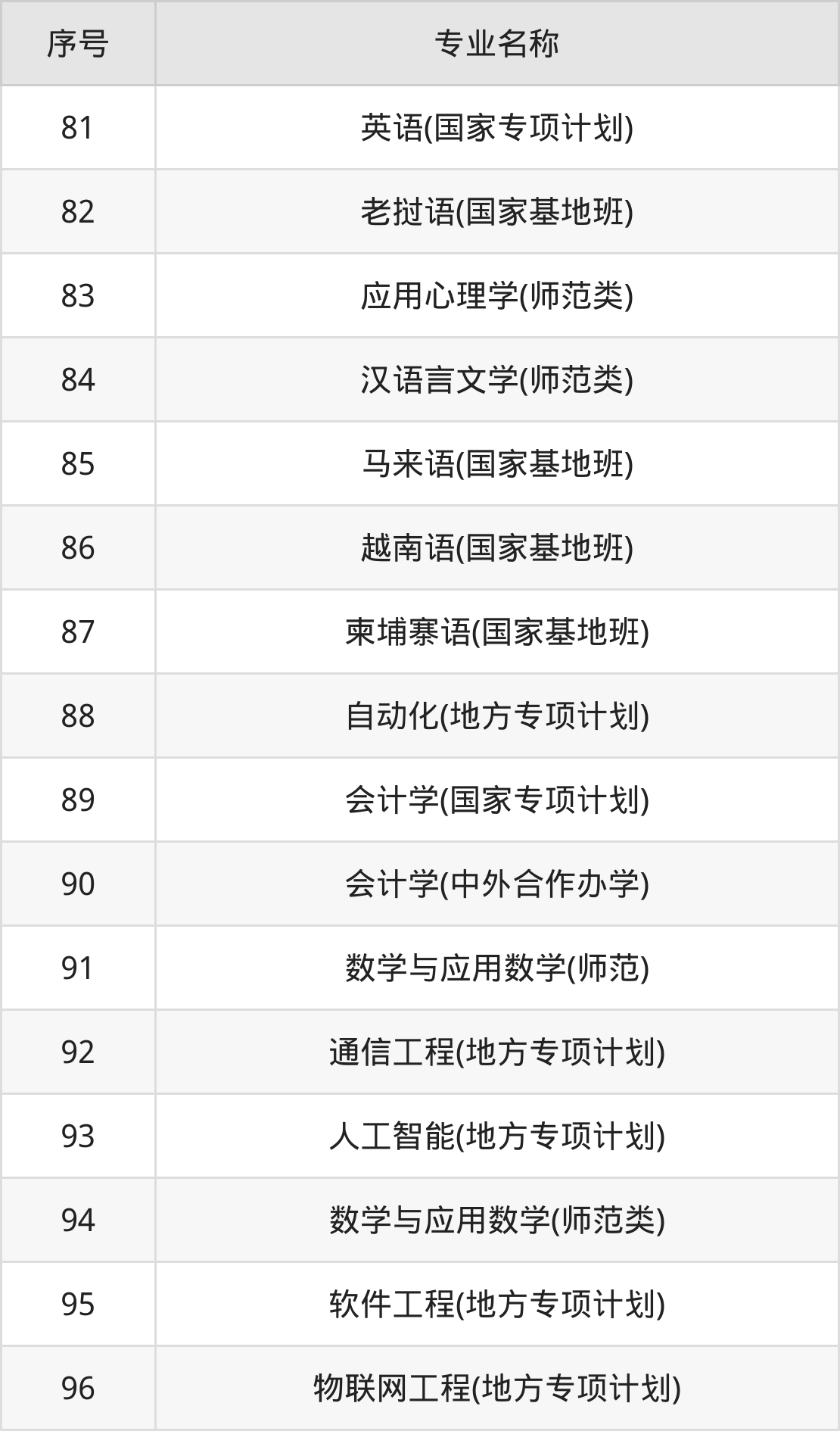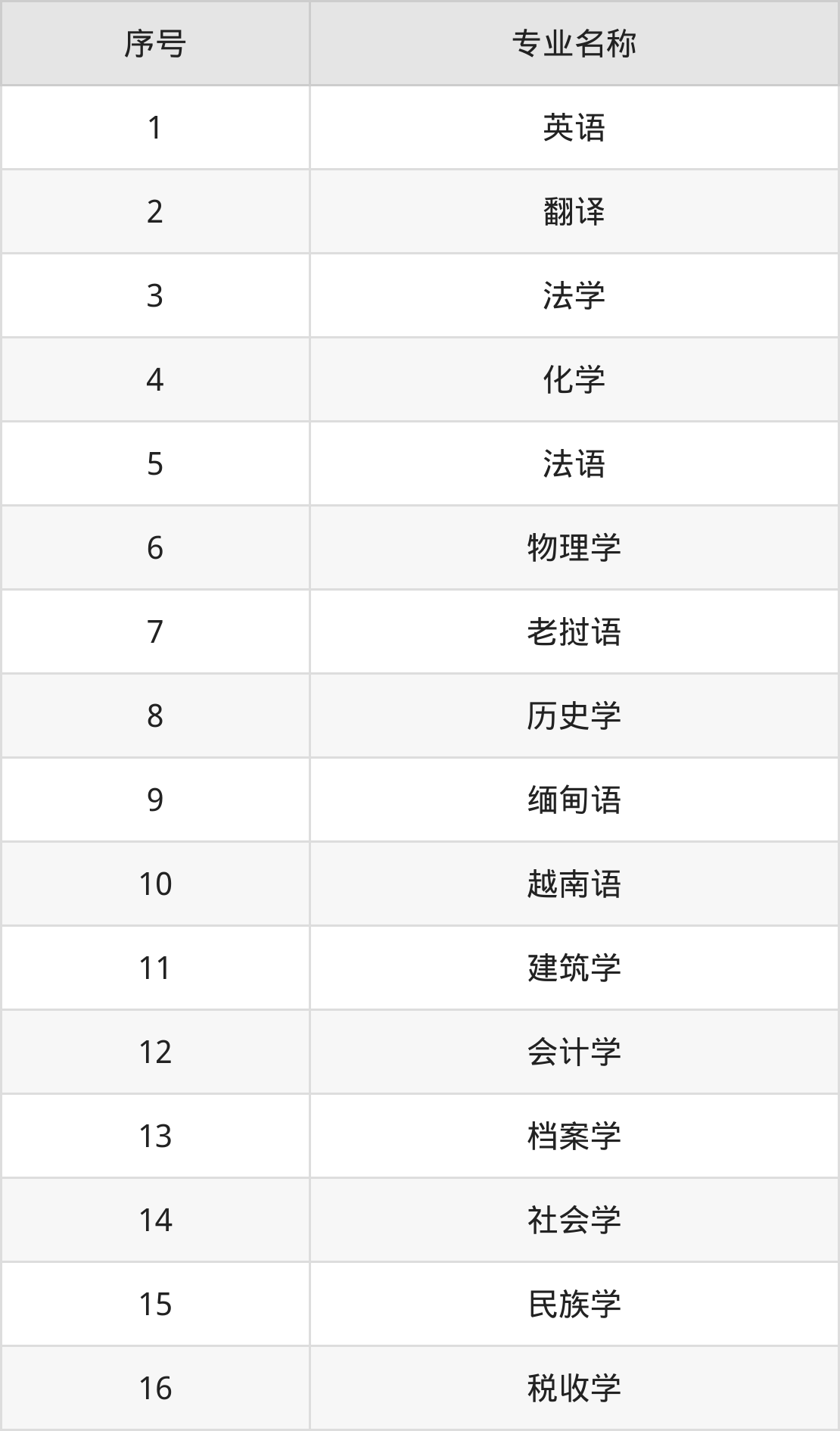 物理类(理科)本科招生专业:化学、英语、法学、翻译、法语、会计学、档案学、经济学、新闻学、老挝语等。