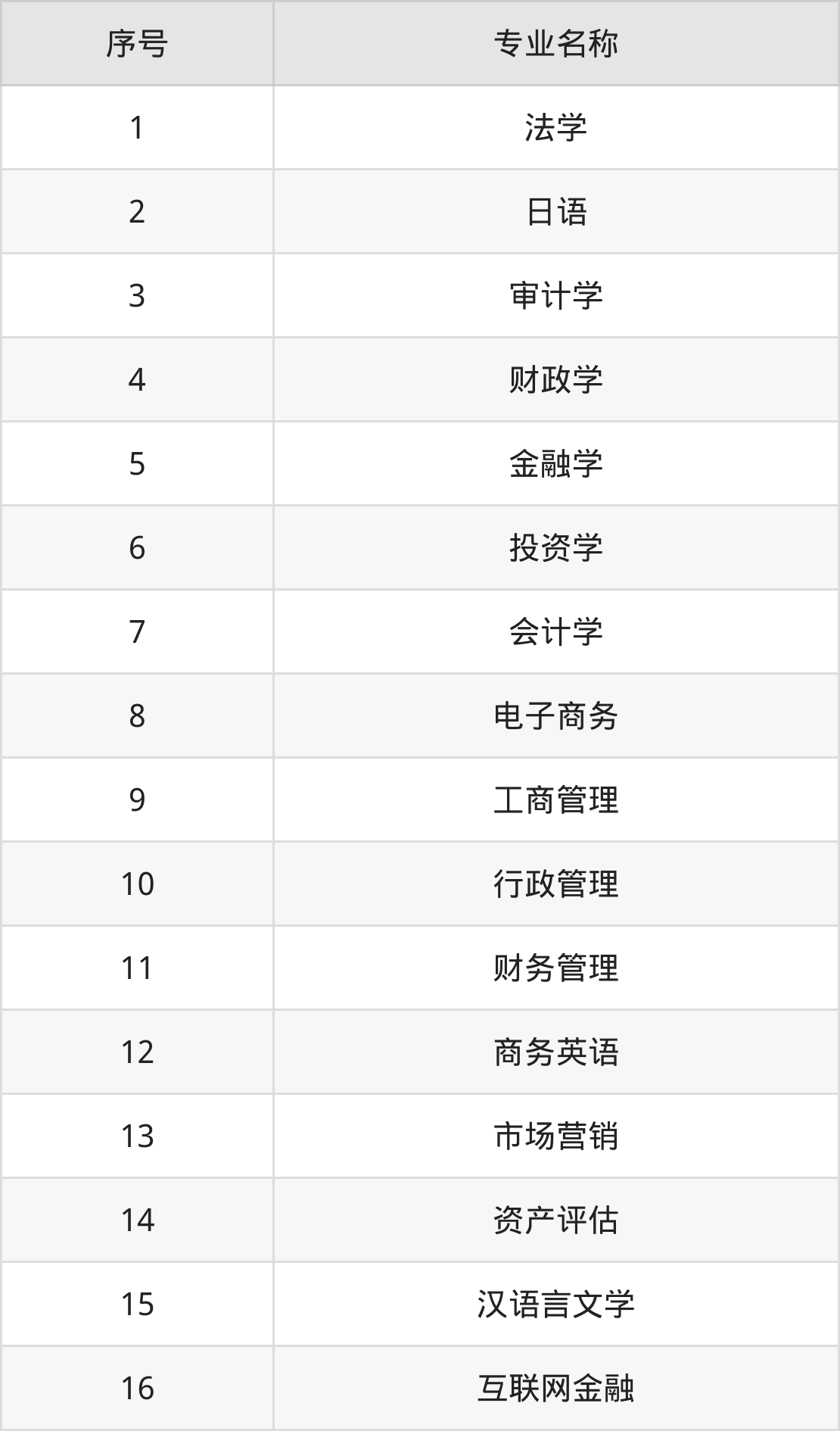 历史类(文科)本科招生专业:法学、日语、审计学、财政学、会计学、金融学、投资学、行政管理、财务管理、资产评估等。