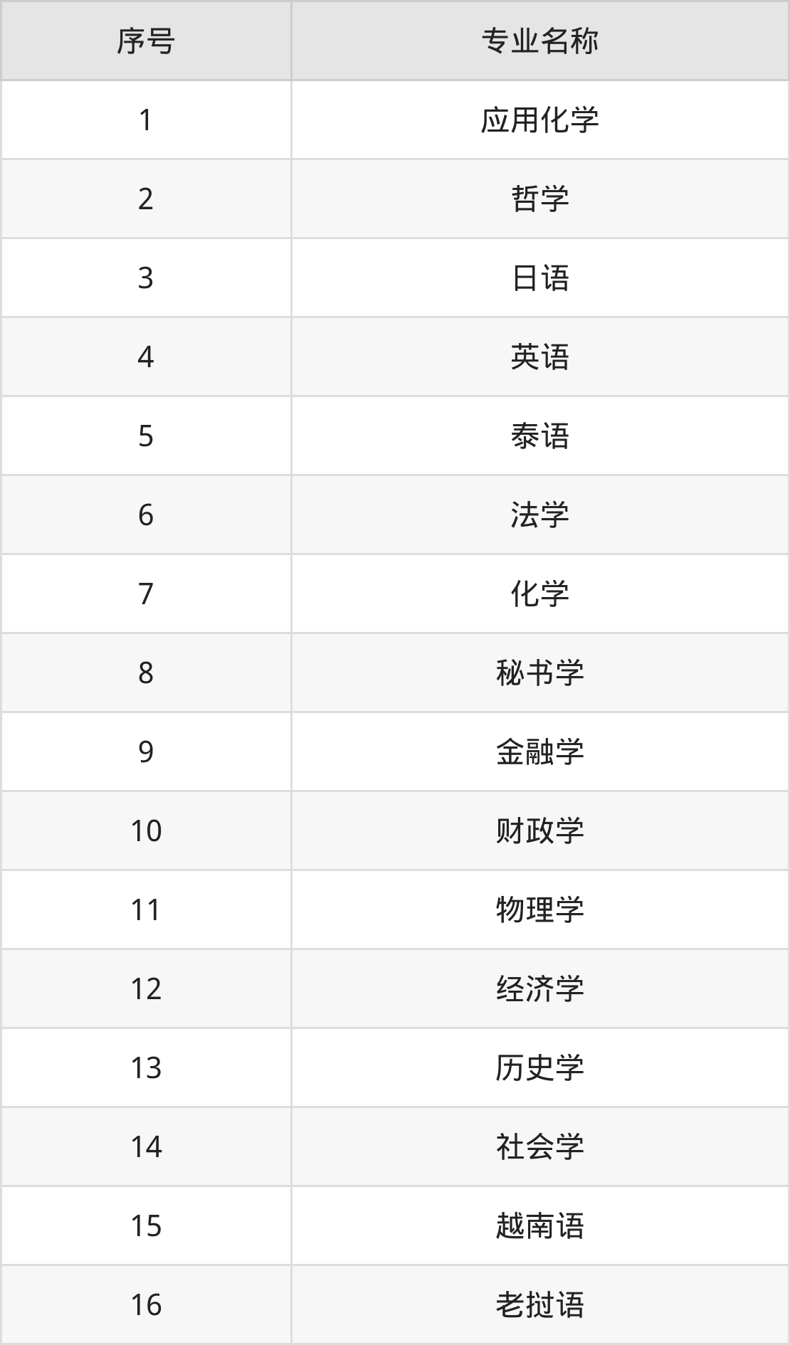 历史类(文科)本科招生专业:泰语、日语、英语、法学、哲学、越南语、经济学、秘书学、财政学、缅甸语等。