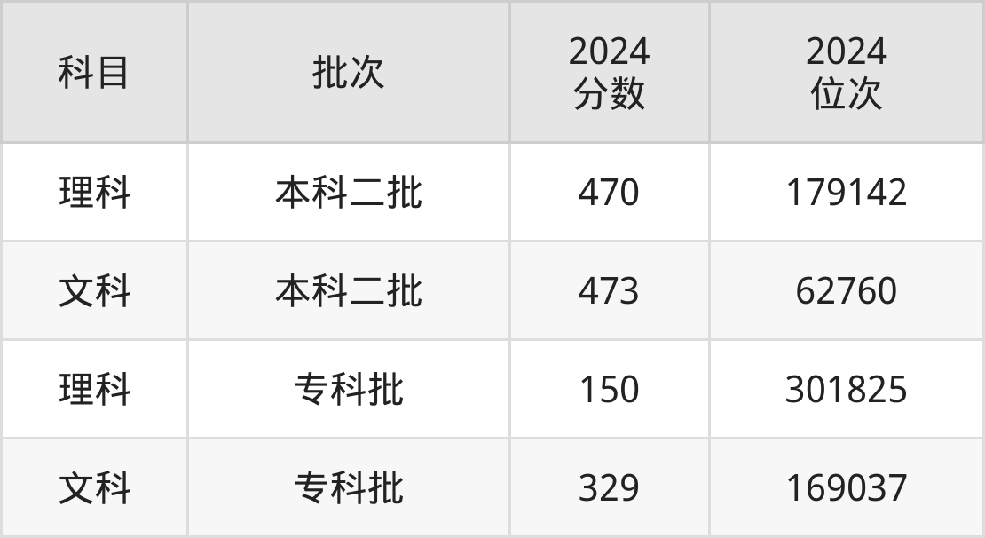 2024年成都艺术职业大学在四川省内专科批的录取分数线都在150分以上,在文科的录取分数线为329分;理科的录取分数线为150分。
