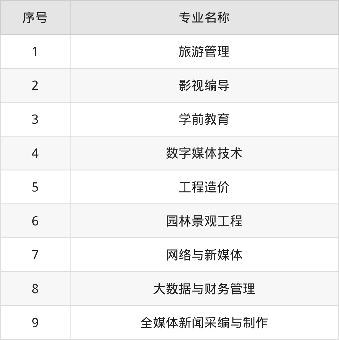 历史类(文科)本科招生专业:旅游管理、影视编导、学前教育、工程造价、园林景观工程、网络与新媒体、大数据与财务管理、全媒体新闻采编与制作。