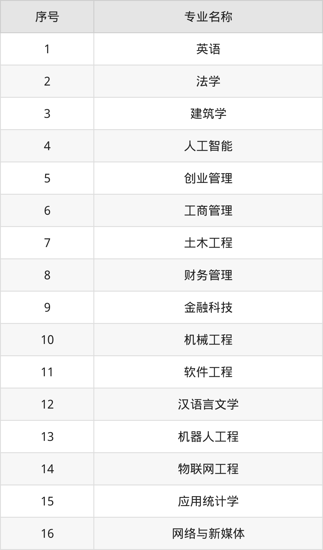 历史类(文科)本科招生专业:法学、英语、建筑学、财务管理、创业管理、工商管理、汉语言文学、网络与新媒体、跨境电子商务、国际经济与贸易。