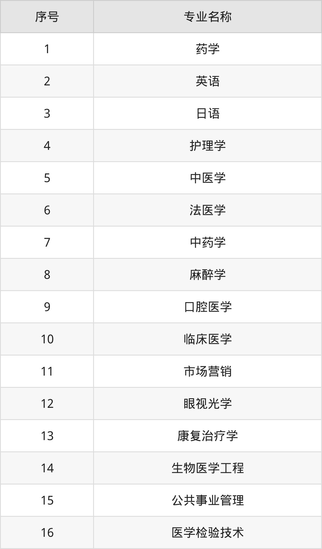 物理类(理科)本科招生专业:药学、英语、日语、护理学、中医学、法医学、中药学、麻醉学、口腔医学、临床医学等。