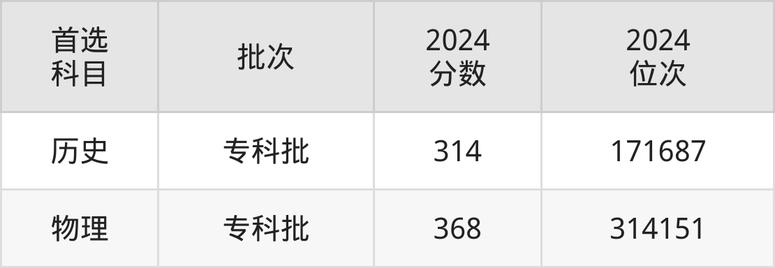 2024年石家庄科技信息职业学院在河北省内专科批的录取分数线都在310分以上,在历史类的录取分数线为314分;物理类的录取分数线为368分。