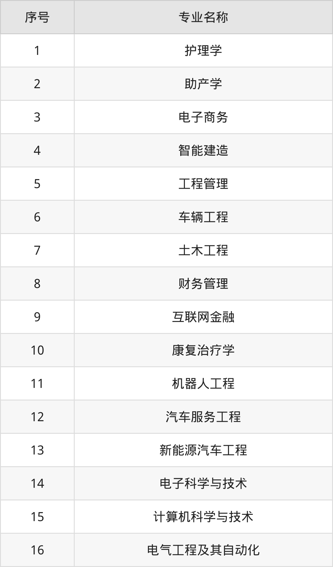 物理类(理科)本科招生专业:护理学、助产学、工程管理、电子商务、车辆工程、土木工程、财务管理、智能建造、机器人工程、互联网金融等。