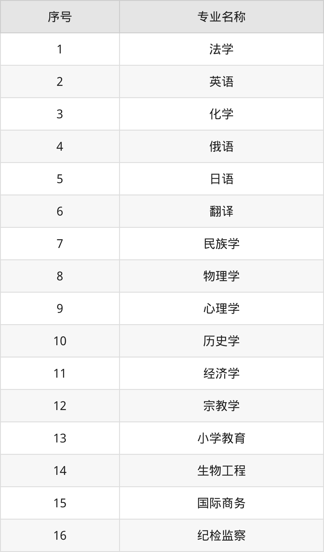 历史类(文科)本科招生专业:日语、英语、俄语、法学、翻译、宗教学、民族学、历史学、社会工作、小学教育等。