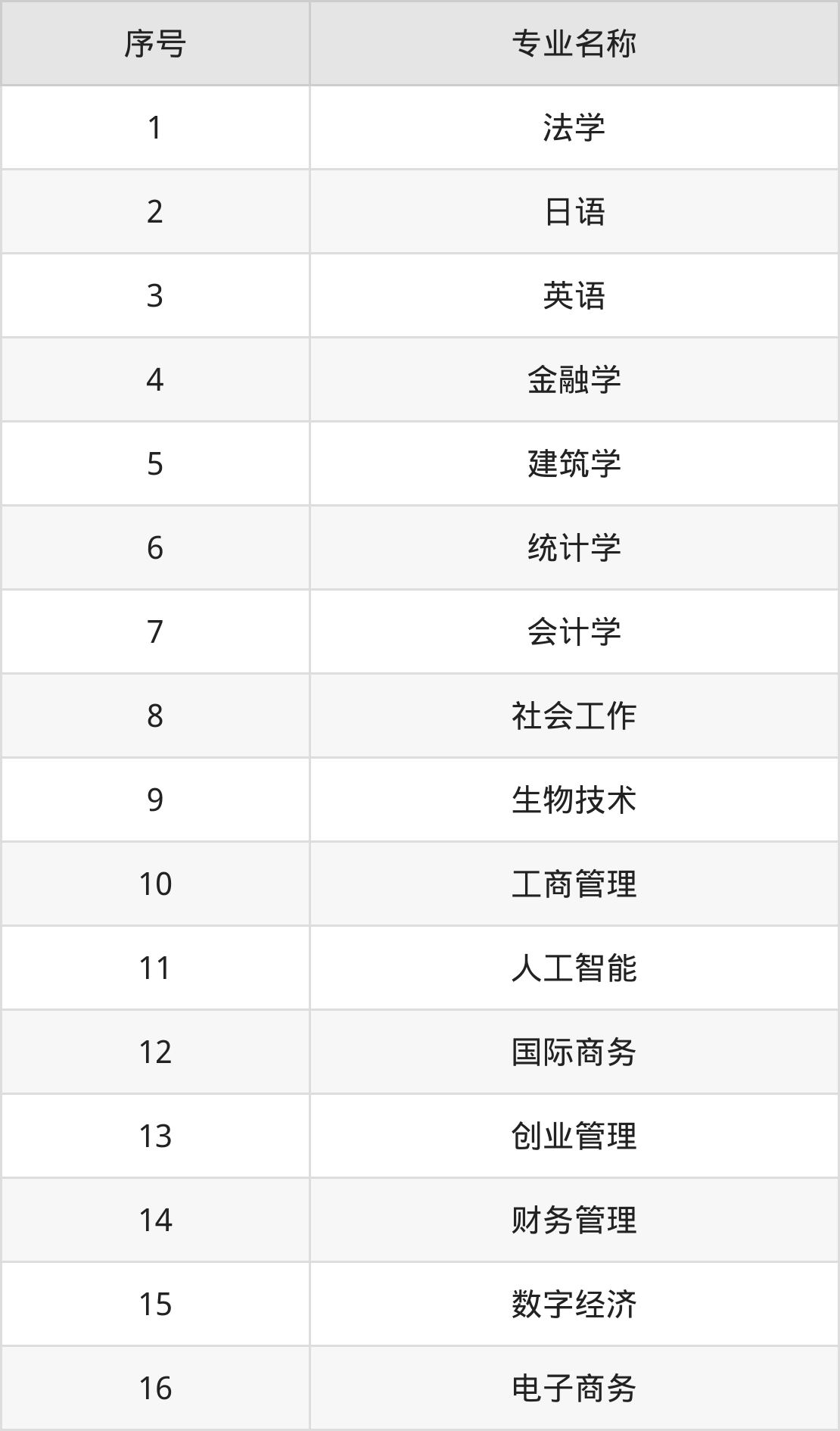历史类(文科)本科招生专业:法学、日语、英语、会计学、金融学、商务英语、知识产权、国际商务、创业管理、财务管理等。