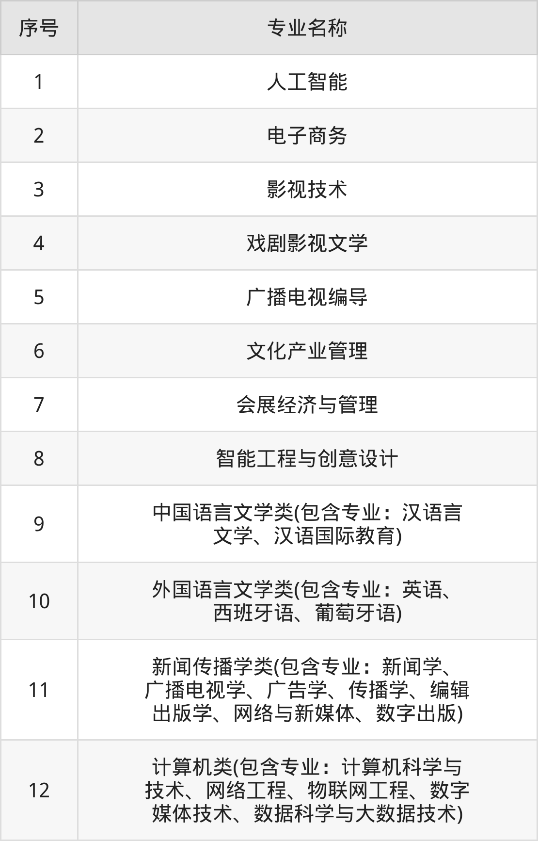 物理类(理科)本科招生专业:人工智能、电子商务、文化产业管理、会展经济与管理、智能工程与创意设计、中国语言文学类(包含专业:汉语言文学、汉语国际教育)、外国语言文学类(包含专业:英语、西班牙语、葡萄牙语)、计算机类(包含专业:计算机科学与技术、网络工程、物联网工程、数字媒体技术、数据科学与大数据技术)、新闻传播学类(包含专业:新闻学、广播电视学、广告学、传播学、编辑出版学、网络与新媒体、数字出版)。