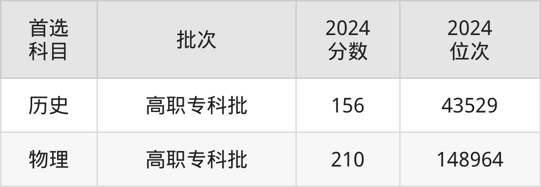 2024年沈阳北软信息职业技术学院在辽宁省内专科批的录取分数线都在150分以上,在历史类的录取分数线为156分;物理类的录取分数线为210分。