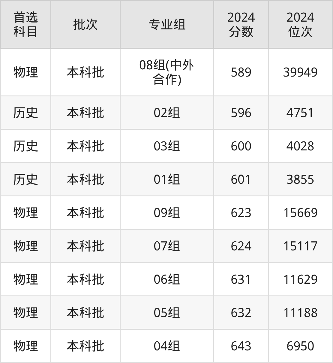 从2024年河海大学在江苏省内的录取分数线来看,本科批录取分数线都在580分以上,录取分数线最高的是04组,2024年最低分为643分;录取分数线最低的是08组(中外合作),2024年最低分为589分。