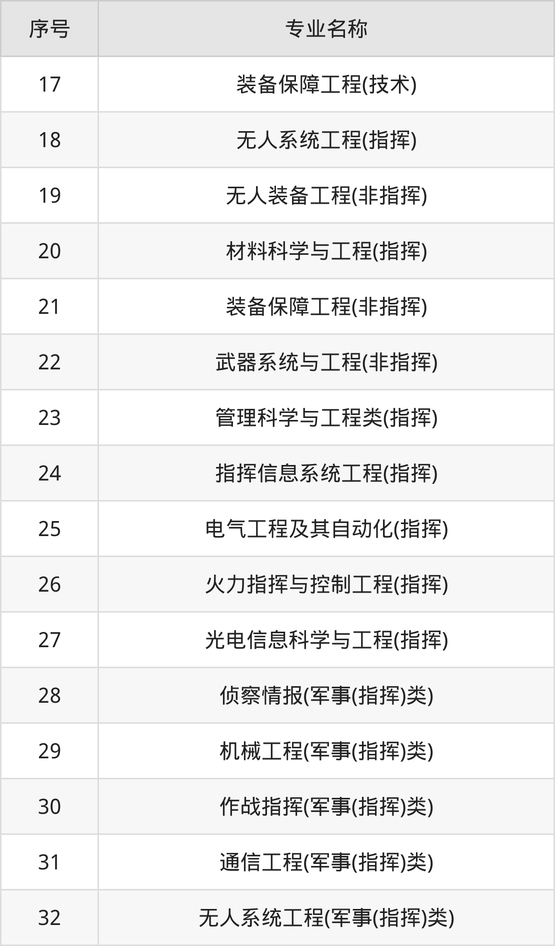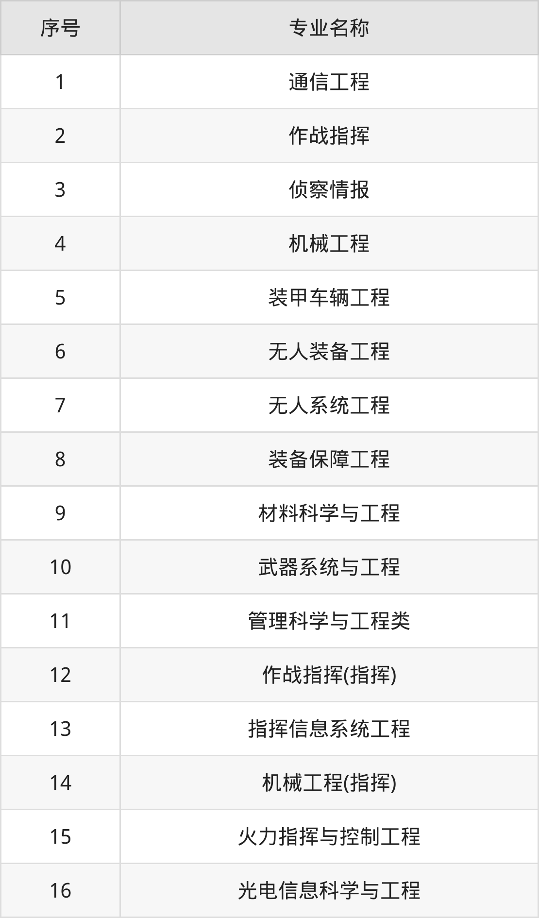 物理类(理科)本科招生专业:作战指挥、侦察情报、通信工程、机械工程、无人系统工程、无人装备工程、装备保障工程、装甲车辆工程、材料科学与工程、武器系统与工程等。