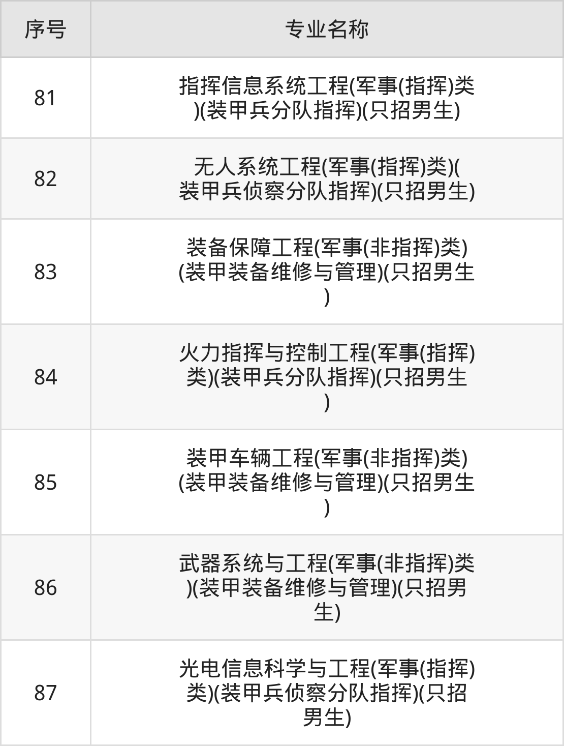 目前,陆军装甲兵学院公布了2024年本科招生专业,共87个。