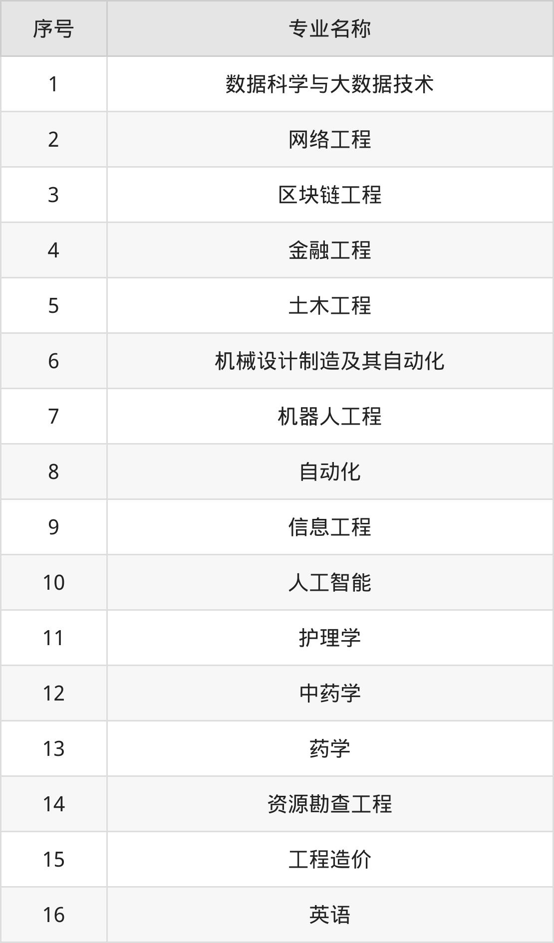 物理类(理科)本科招生专业:数据科学与大数据技术、网络工程、区块链工程、金融工程、土木工程、机械设计制造及其自动化、机器人工程、自动化、信息工程、人工智能等。