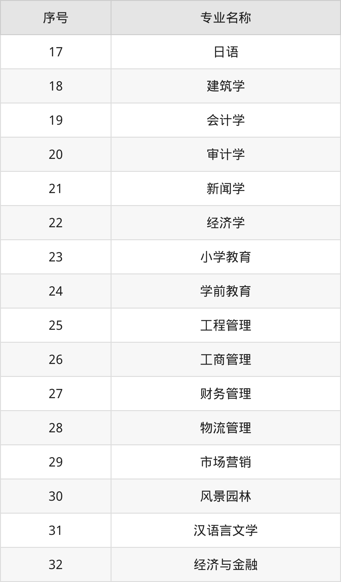 历史类(文科)本科招生专业:日语、英语、新闻学、会计学、建筑学、审计学、经济学、财务管理、学前教育、风景园林等。