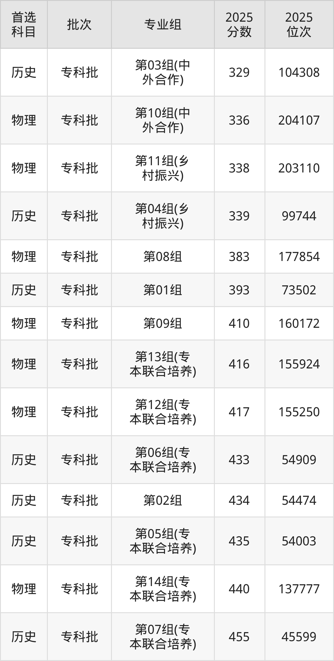 2025年黄冈职业技术大学在湖北省内专科批的录取分数线都在320分以上,在历史类的录取分数线在329分-455分之间;物理类的录取分数线在336分-440分之间。