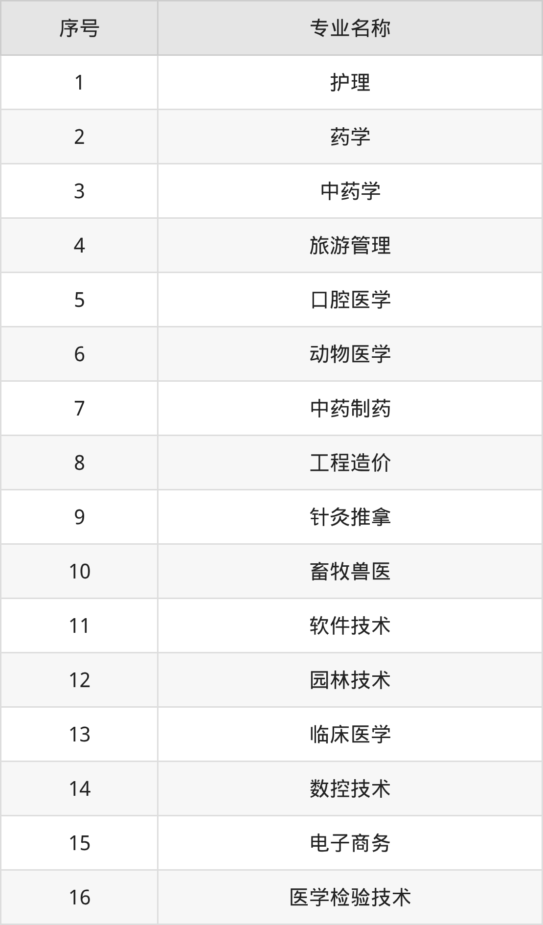 本科招生专业:工业机器人技术、数字化设计与制造技术、人工智能技术应用、电子商务、针灸推拿、老年保健与管理、护理、临床医学、口腔医学、新能源汽车技术。