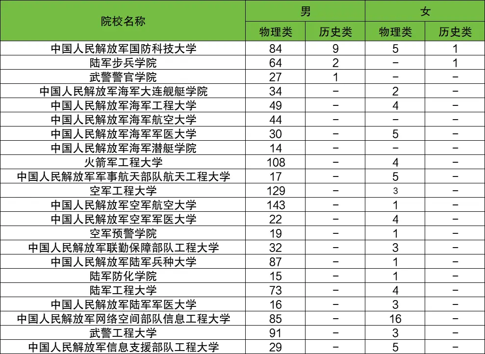2025年全国22所军校在河北招生计划总人数1296人,其中男生1224人、女生72人。下面是各个军校招生人数情况汇总: