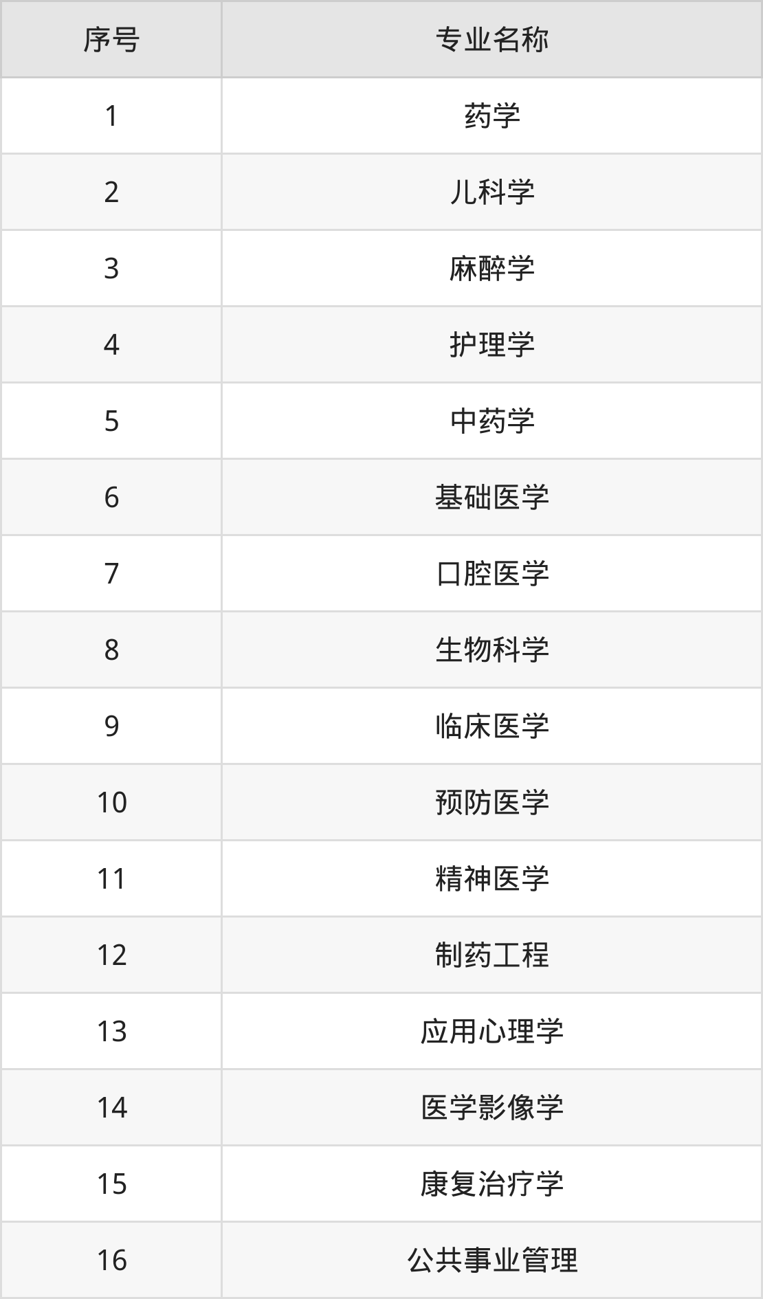 物理类(理科)本科招生专业:药学、中药学、护理学、麻醉学、儿科学、生物科学、制药工程、临床医学、精神医学、基础医学等。