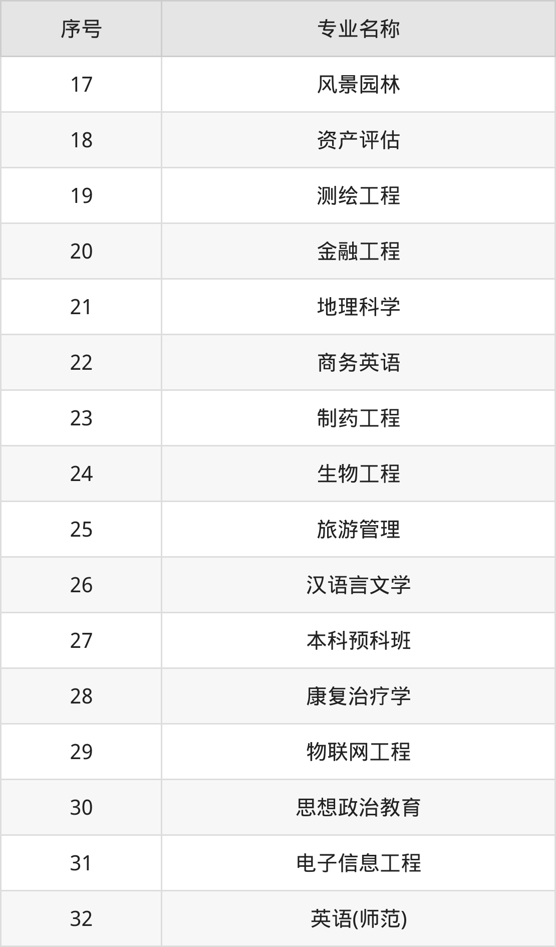 历史类(文科)本科招生专业:法学、园林、英语、助产学、新闻学、会计学、护理学、资产评估、旅游管理、风景园林等。