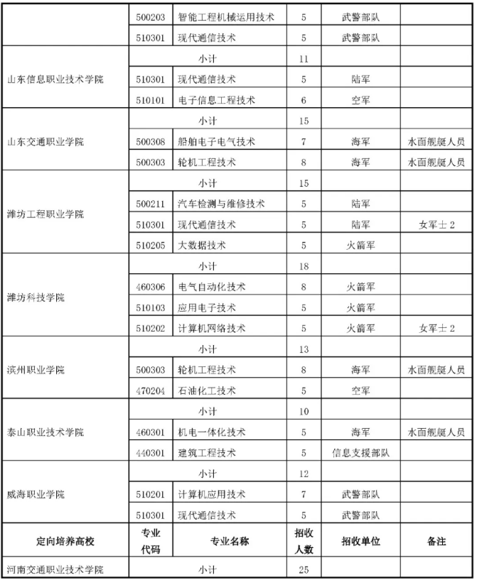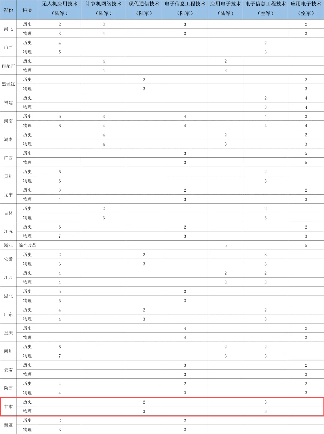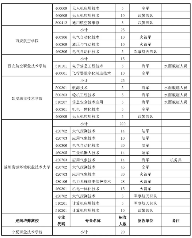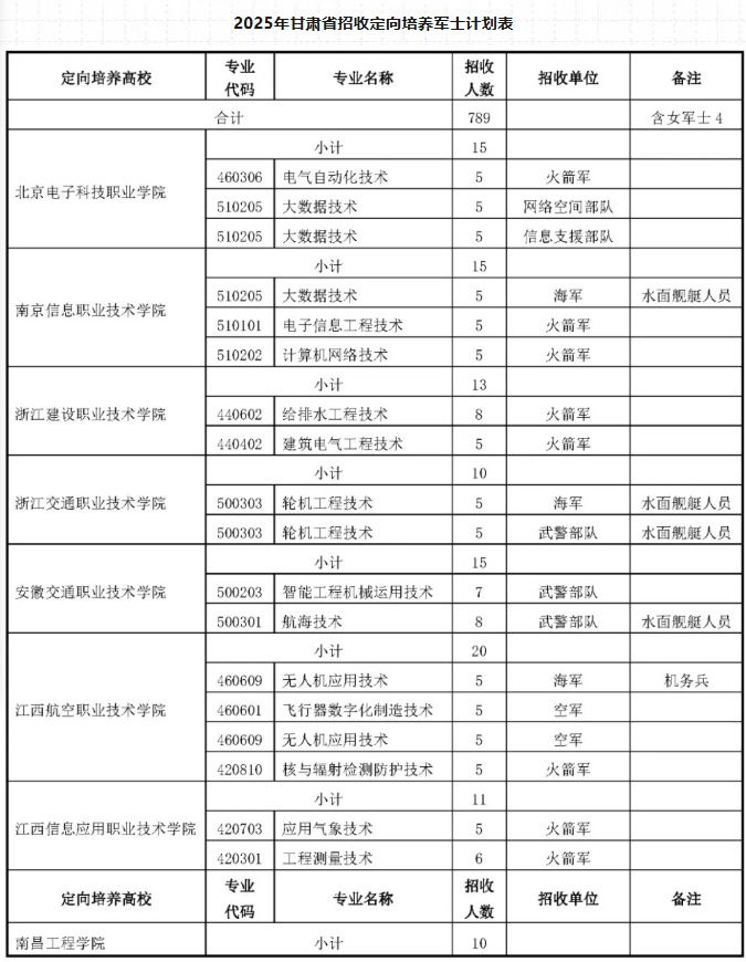 2025年甘肃定向士官招生计划共计789人,其中江西航空职业技术学院招20人、山东信息职业技术学院招11人。