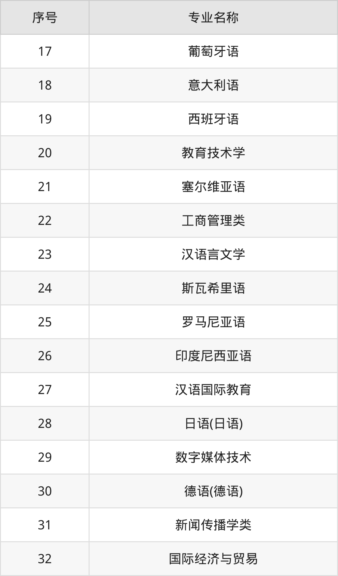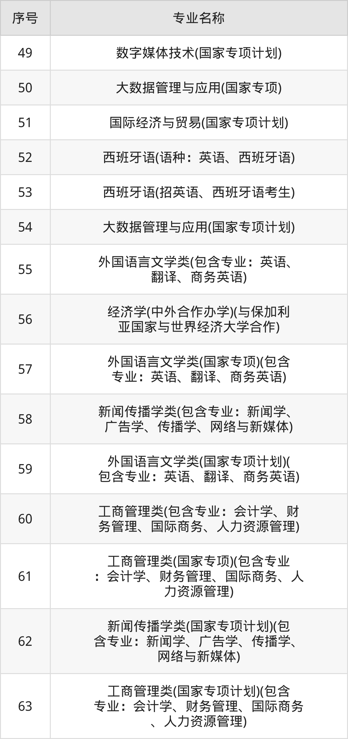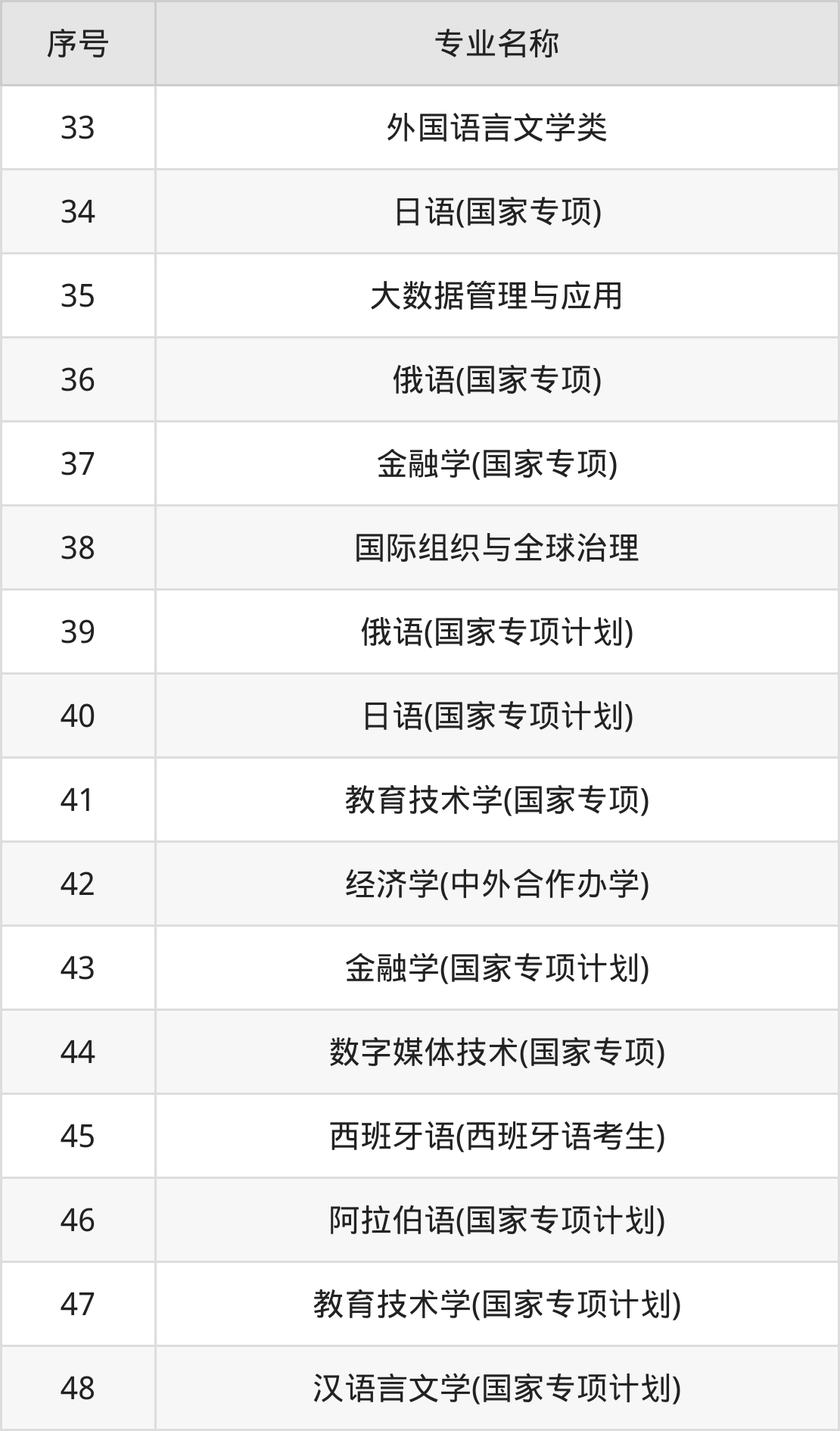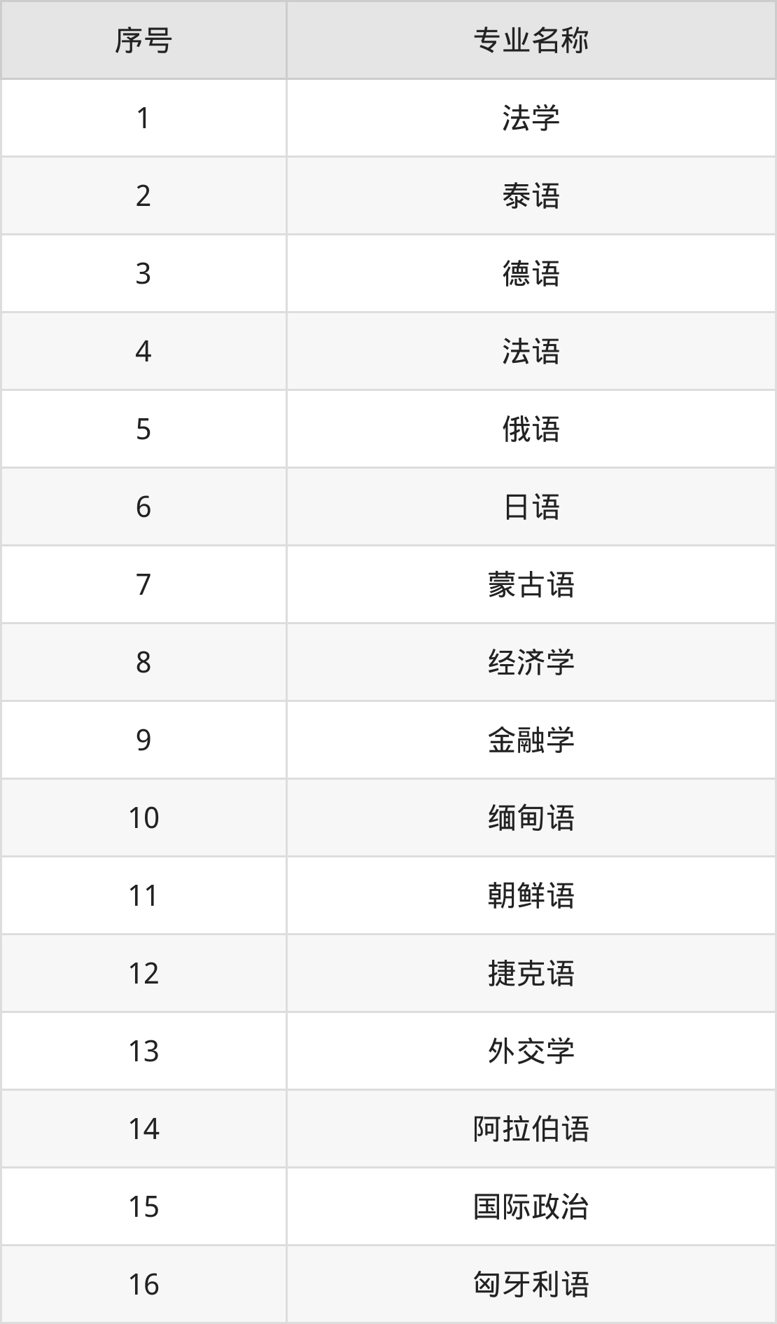 历史类(文科)本科招生专业:法学、泰语、德语、俄语、法语、日语、经济学、外交学、捷克语、蒙古语等。