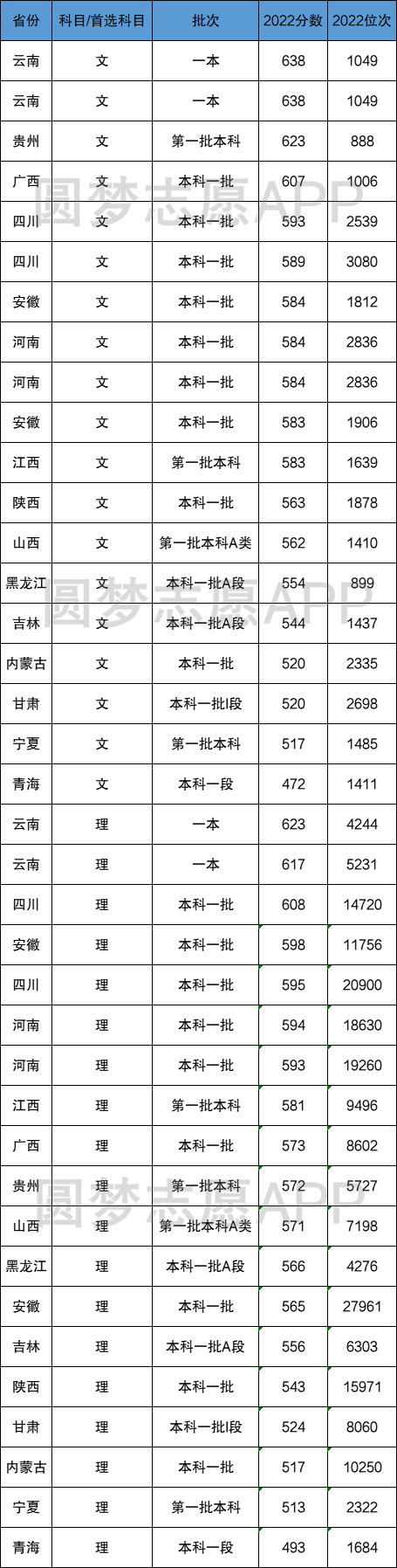 在沿用旧高考模式的15个省份中,西南政法大学文科录取分数线最高的是云南(638分,1049名),录取分数线最低的是青海(472分,1411名)。理科录取分数线最高的是云南(623分,4244名),录取分数线最低的是青海(493分,1684名)。