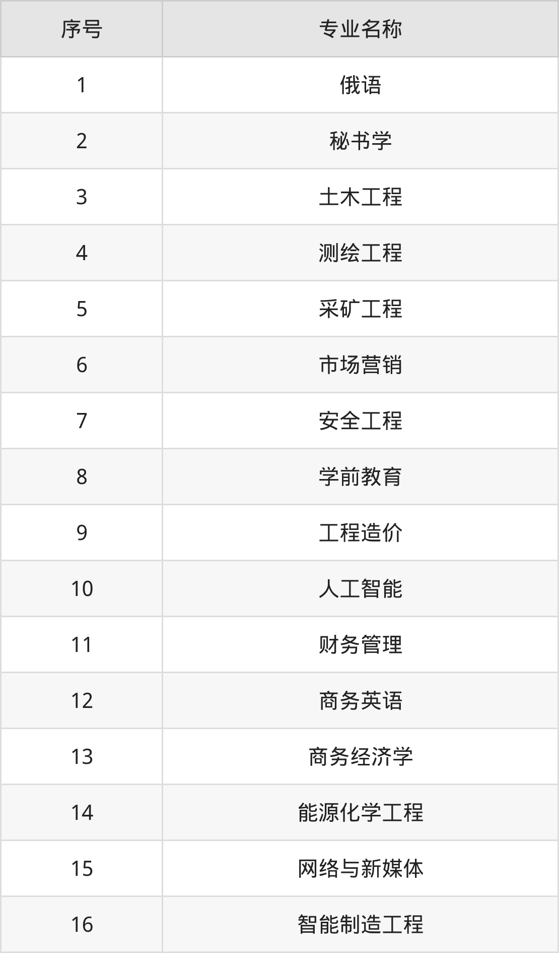 物理类(理科)本科招生专业:俄语、工程造价、安全工程、人工智能、财务管理、土木工程、测绘工程、采矿工程、市场营销、商务英语等。