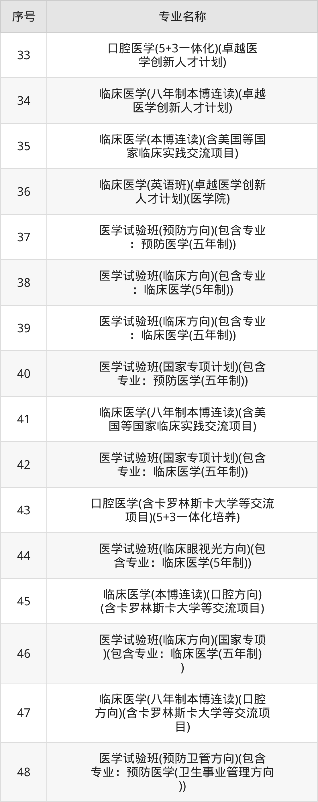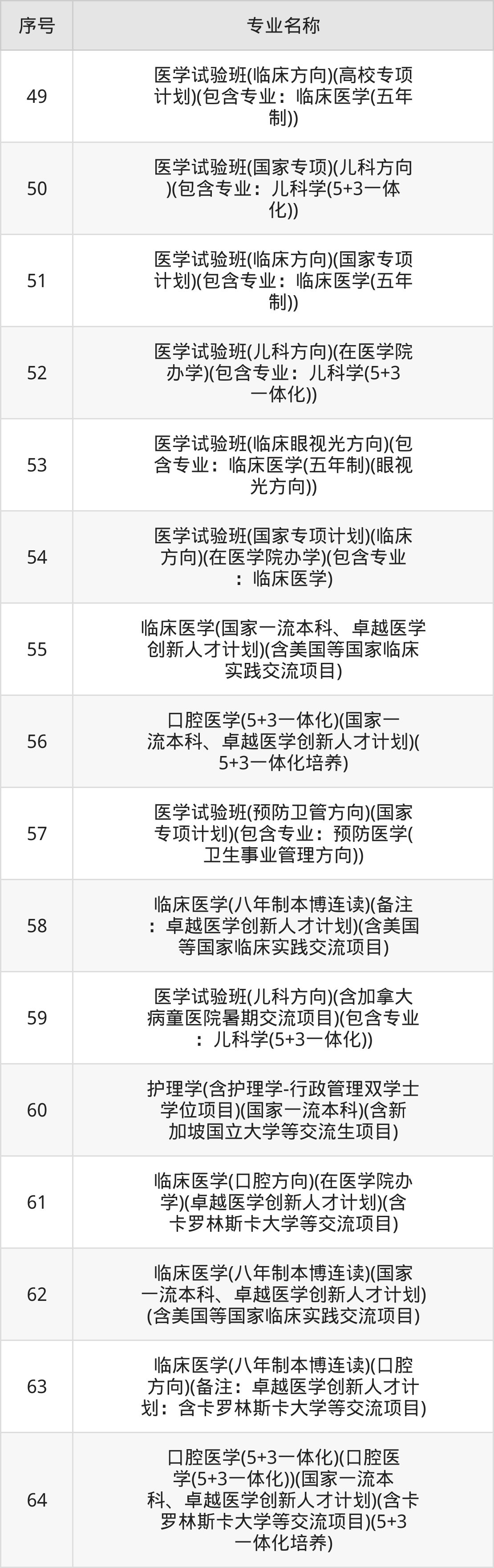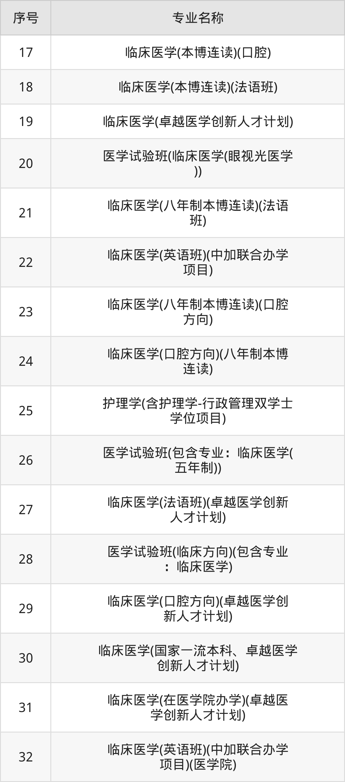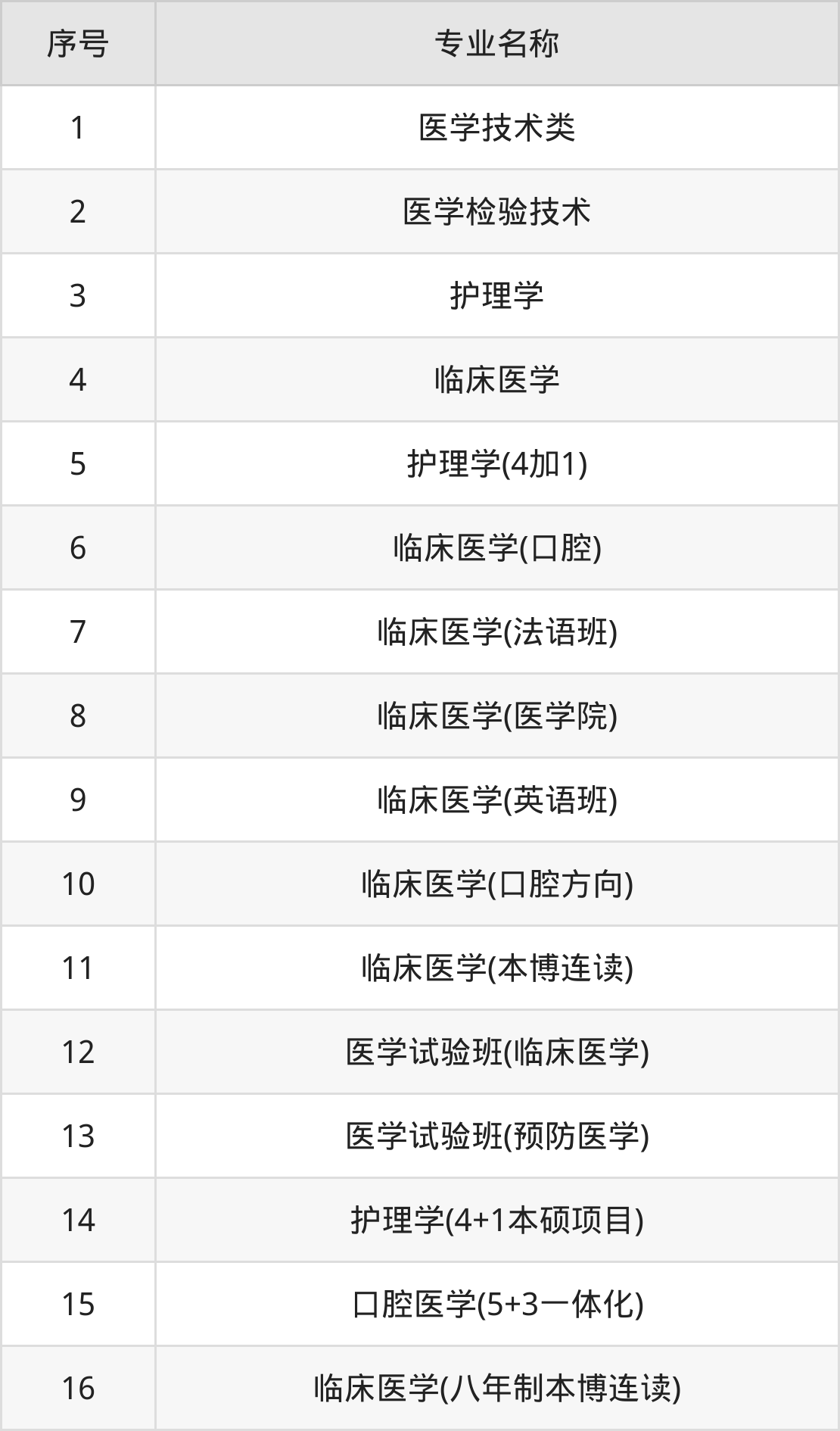 物理类(理科)本科招生专业:临床医学、护理学(4加1)、临床医学(口腔)、临床医学(法语班)、临床医学(口腔方向)、临床医学(本博连读)、医学试验班(预防医学)、医学试验班(临床医学)、口腔医学(5+3一体化)、临床医学(八年制本博连读)等。