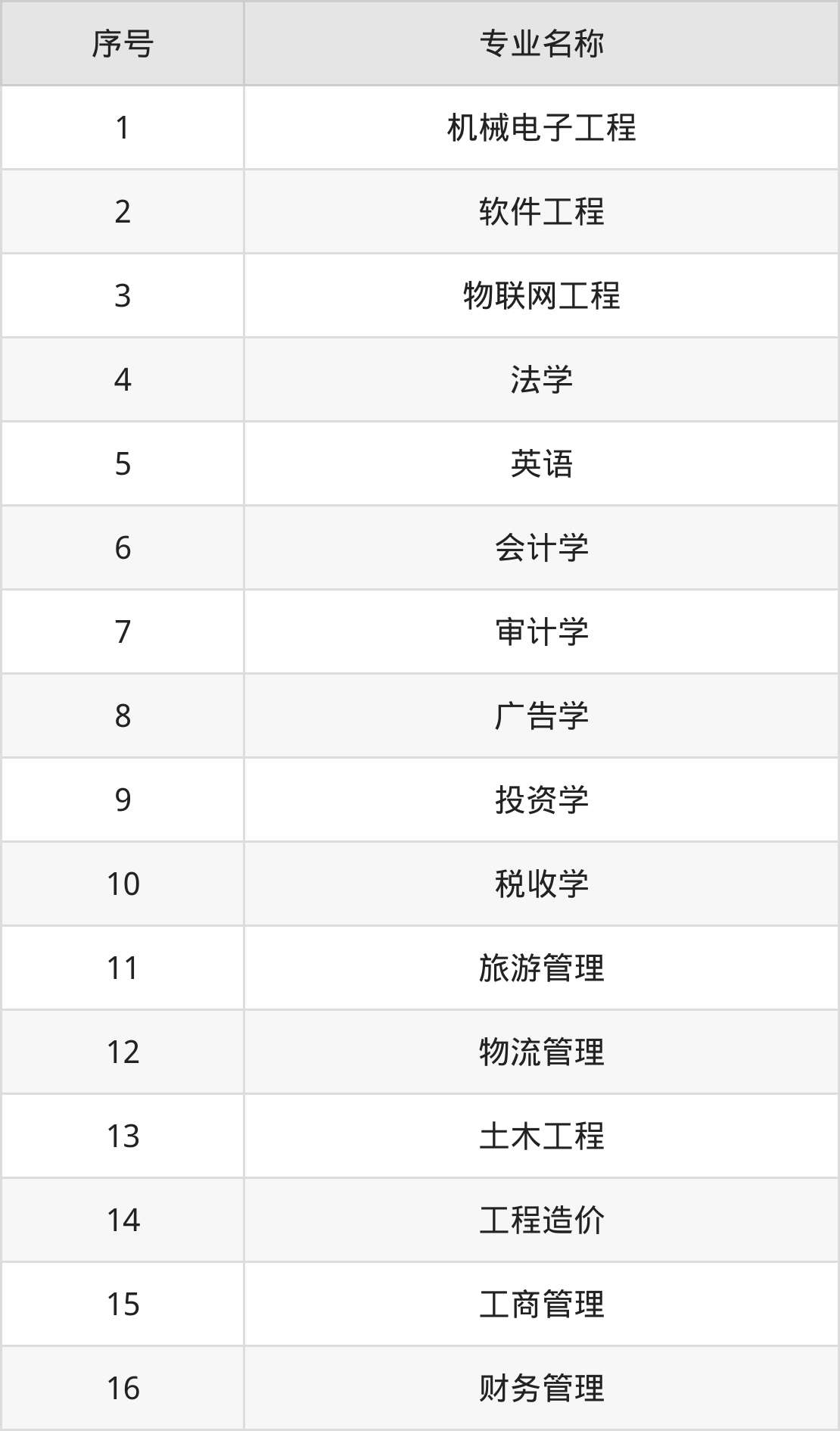 物理类(理科)本科招生专业:机械电子工程、软件工程、物联网工程、英语、法学、会计学、审计学、广告学、投资学、税收学等。