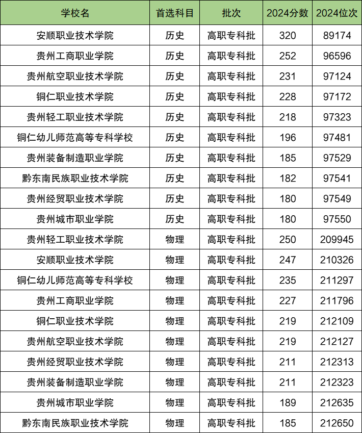 2025年贵州省前十名专科大学在贵州省历史类招生分数线在320分~180分之间,最低位次在89174~97550名。如贵州轻工职业技术学院最低218分、贵州城市职业学院最低180分、贵州航空职业技术学院最低231分。